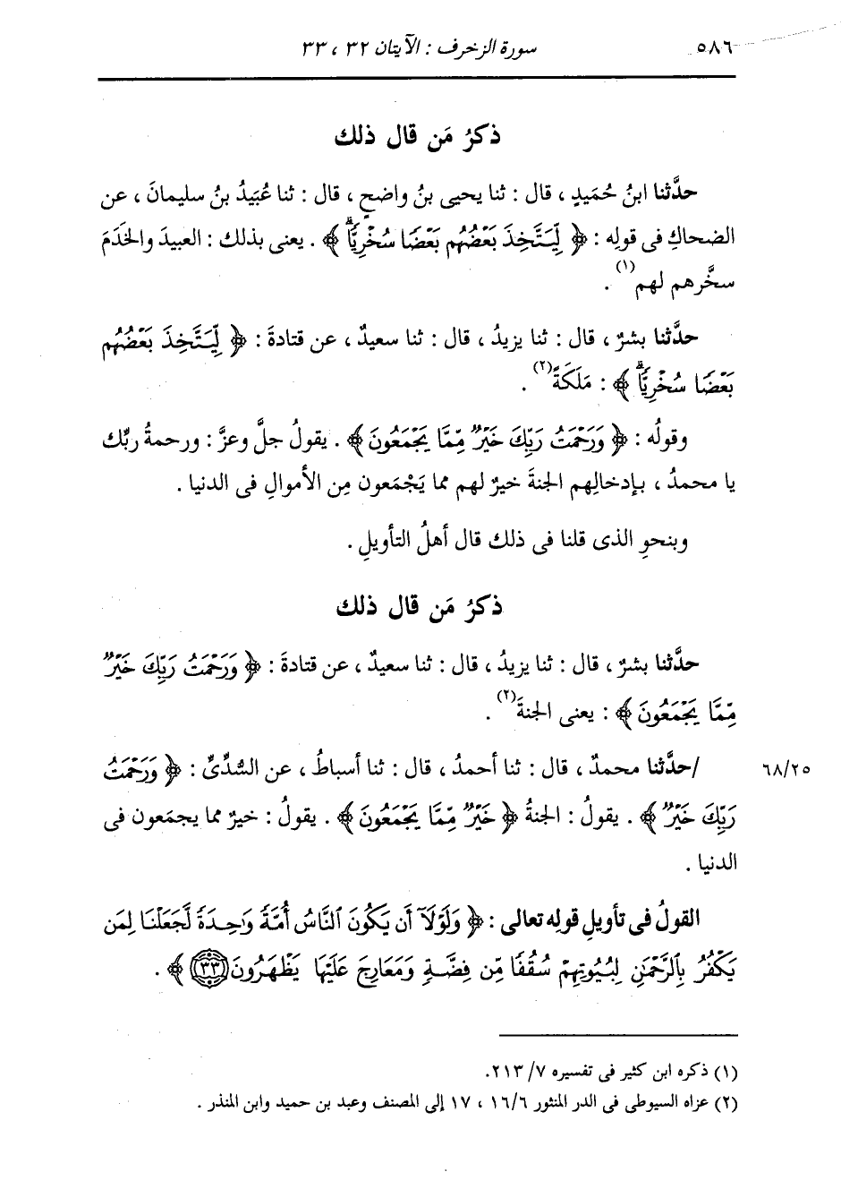 حَدَّثَنَا بِشْرٌ قَالَ: ثَنَا يَزِيدُ قَالَ: ثَنَا سَعِيدٌ، عَنْ قَتَادَةَ، {§لِيَتَّخِذَ بَعْضُهُمْ بَعْضًا سُخْرِيًّا} [الزخرف: 32] «مَلَكَةً»