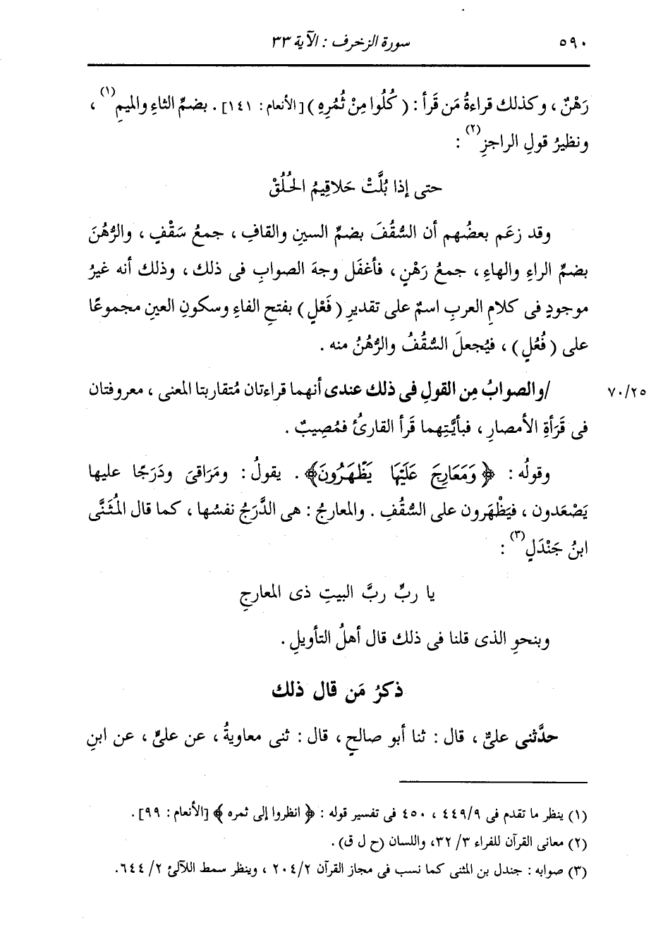 ذِكْرُ مَنْ قَالَ ذَلِكَ: حَدَّثَنِي عَلِيُّ قَالَ: ثَنَا أَبُو صَالِحٍ قَالَ: ثَنِي مُعَاوِيَةُ، عَنْ عَلِيٍّ، عَنِ ابْنِ -[591]- عَبَّاسٍ، {§وَمَعَارِجَ} [الزخرف: 33] قَالَ: «مَعَارِجُ مِنْ فِضَّةٍ، وَهِيَ دَرَجٌ»