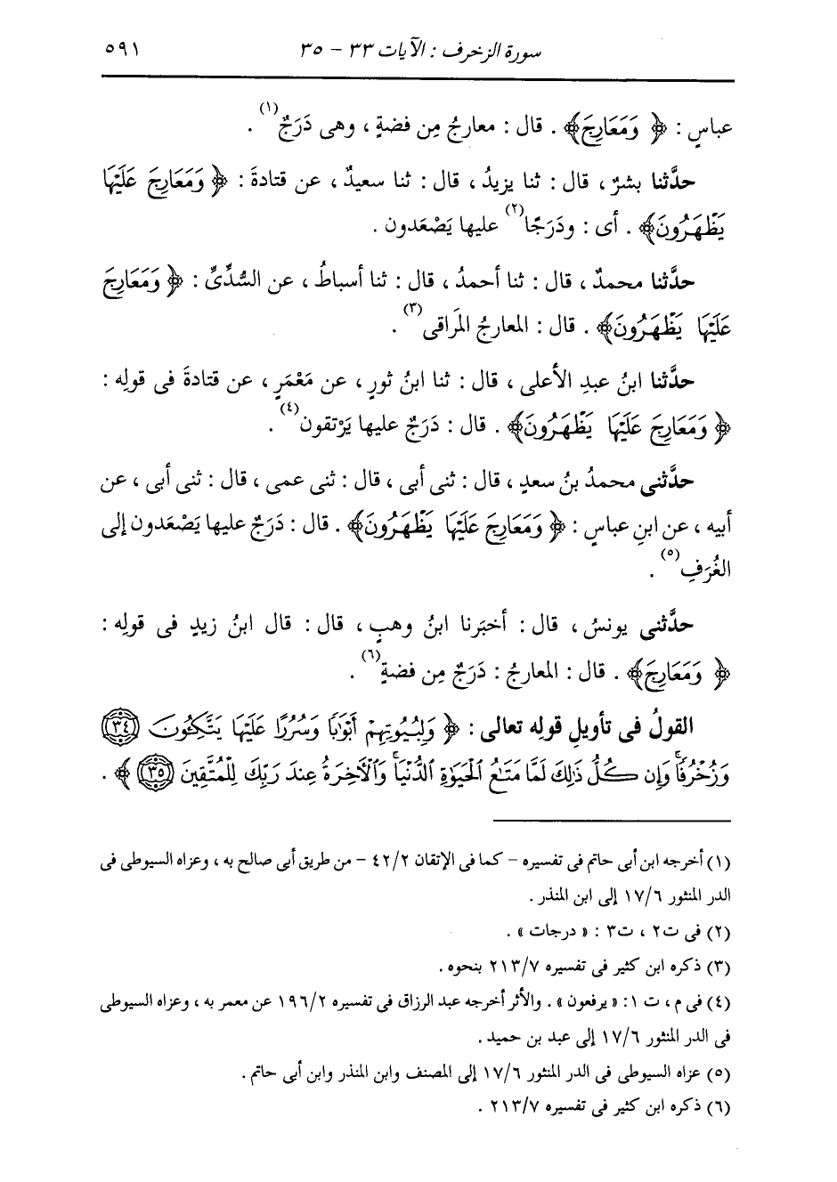 حَدَّثَنِي مُحَمَّدُ بْنُ سَعْدٍ قَالَ: ثَنِي أَبِي قَالَ: ثَنِي عَمِّي قَالَ: ثَنِي أَبِي، عَنِ ابْنِ عَبَّاسِ قَوْلَهُ: {§وَمَعَارِجَ عَلَيْهَا يَظْهَرُونَ} [الزخرف: 33] قَالَ: «دَرَجٌ عَلَيْهَا يَصْعَدُونَ إِلَى الْغُرَفِ»