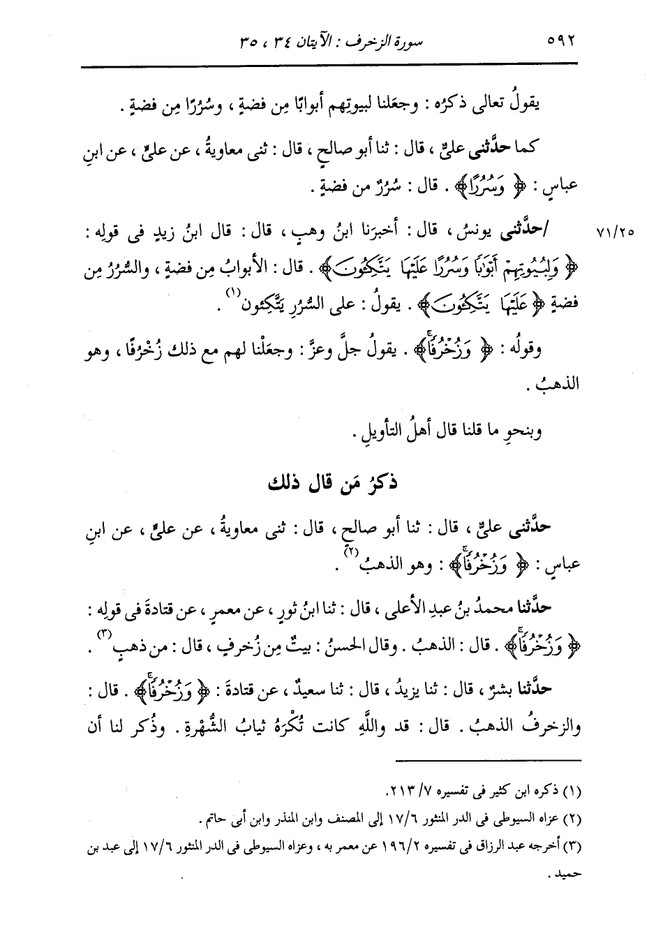 ذِكْرُ مَنْ قَالَ ذَلِكَ: حَدَّثَنِي عَلِيُّ قَالَ: ثَنَا أَبُو صَالِحٍ قَالَ: ثَنِي مُعَاوِيَةُ، عَنْ عَلِيٍّ، عَنِ ابْنِ عَبَّاسٍ، {§وُزُخْرُفًا} [الزخرف: 35] «وَهُوَ الذَّهَبُ»
