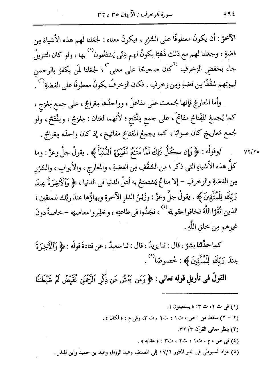 الثَّانِي: أَنْ يَكُونَ مَعْطُوفًا عَلَى السُّرُرِ، فَيَكُونُ مَعْنَاهُ: لَجَعَلْنَا لَهُمْ هَذِهِ الْأَشْيَاءَ مِنْ فِضَّةٍ، وَجَعَلْنَا لَهُمْ مَعَ ذَلِكَ ذَهَبًا يَكُونُ لَهُمْ غِنًى يَسْتَغْنَونَ بِهَا، وَلَوْ كَانَ التَّنْزِيلُ جَاءَ بِخَفْضِ الزُّخْرُفِ لَكَانَ: لَجَعَلْنَا لِمَنْ يَكْفُرُ بِالرَّحْمَنِ لِبُيُوتِهِمْ سُقُفًا مِنْ فِضَّةٍ وَمِنْ زُخْرُفٍ، فَكَانَ الزُّخْرُفُ يَكُونُ مَعْطُوفًا عَلَى الْفِضَّةِ وَأَمَّا الْمَعَارِجُ فَإِنَّهَا جُمِعَتْ عَلَى مَفَاعِلٍ، وَوَاحِدُهَا مِعْرَاجٌ، عَلَى جَمْعِ مِعْرَجٍ، كَمَا يُجْمَعُ الْمِفْتَاحُ مَفَاتِحُ عَلَى جَمْعِ مِفْتَحٍ، لِأَنَّهُمَا لُغَتَانِ: مِعْرَجٌ، وَمِفْتَحٌ، وَلَوْ جُمِعَ مَعَارِيجُ كَانَ صَوَابًا، كَمَا يُجْمَعُ الْمِفْتَاحُ مَفَاتِيحَ، إِذْ كَانَ وَاحِدُهُ مِعْرَاجٌ