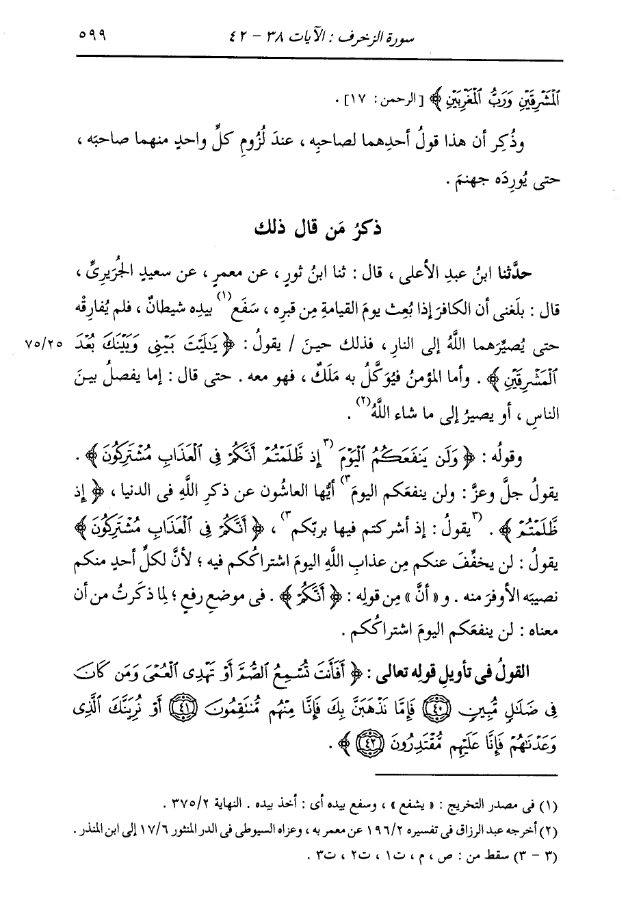 ذِكْرُ مَنْ قَالَ ذَلِكَ: حَدَّثَنَا ابْنُ عَبْدِ الْأَعْلَى قَالَ: ثَنَا ابْنُ ثَوْرٍ، عَنْ مَعْمَرٍ، عَنْ سَعِيدٍ الْجُرَيْرِيِّ قَالَ: " بَلَغَنِي أَنَّ §الْكَافِرَ إِذَا بُعِثَ يَوْمَ الْقِيَامَةِ مِنْ قَبْرِهِ، سَفَعَ بِيَدِهِ الشَّيْطَانَ، فَلَمْ يُفَارِقْهُ حَتَّى يُصَيِّرَهُمَا اللَّهُ إِلَى النَّارِ، فَذَلِكَ حِينَ يَقُولُ: يَا لَيْتَ بَيْنِي وَبَيْنَكَ بُعْدَ الْمَشْرِقَيْنِ، فَبِئْسَ الْقَرِينُ وَأَمَّا الْمُؤْمِنُ فَيُوَكَّلُ بِهِ مَلَكٌ فَهُوَ مَعَهُ حَتَّى قَالَ: إِمَّا يُفْصَلُ بَيْنَ النَّاسِ، أَوْ نَصِيرُ إِلَى مَا شَاءَ اللَّهُ "