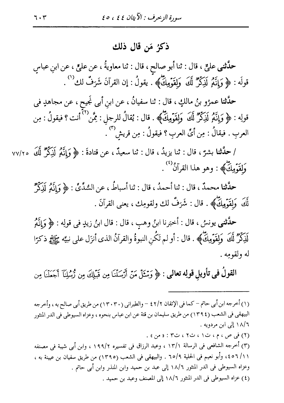 ذِكْرُ مَنْ قَالَ ذَلِكَ: حَدَّثَنِي عَلِيُّ قَالَ: ثَنَا أَبُو صَالِحٍ قَالَ: ثَنَا مُعَاوِيَةُ، عَنْ عَلِيٍّ، عَنِ ابْنِ عَبَّاسٍ، قَوْلَهُ: {§وَإِنَّهُ لَذِكْرٌ لَكَ وَلِقَوْمِكَ} [الزخرف: 44] يَقُولُ: «إِنَّ الْقُرْآنَ شَرَفٌ لَكَ»