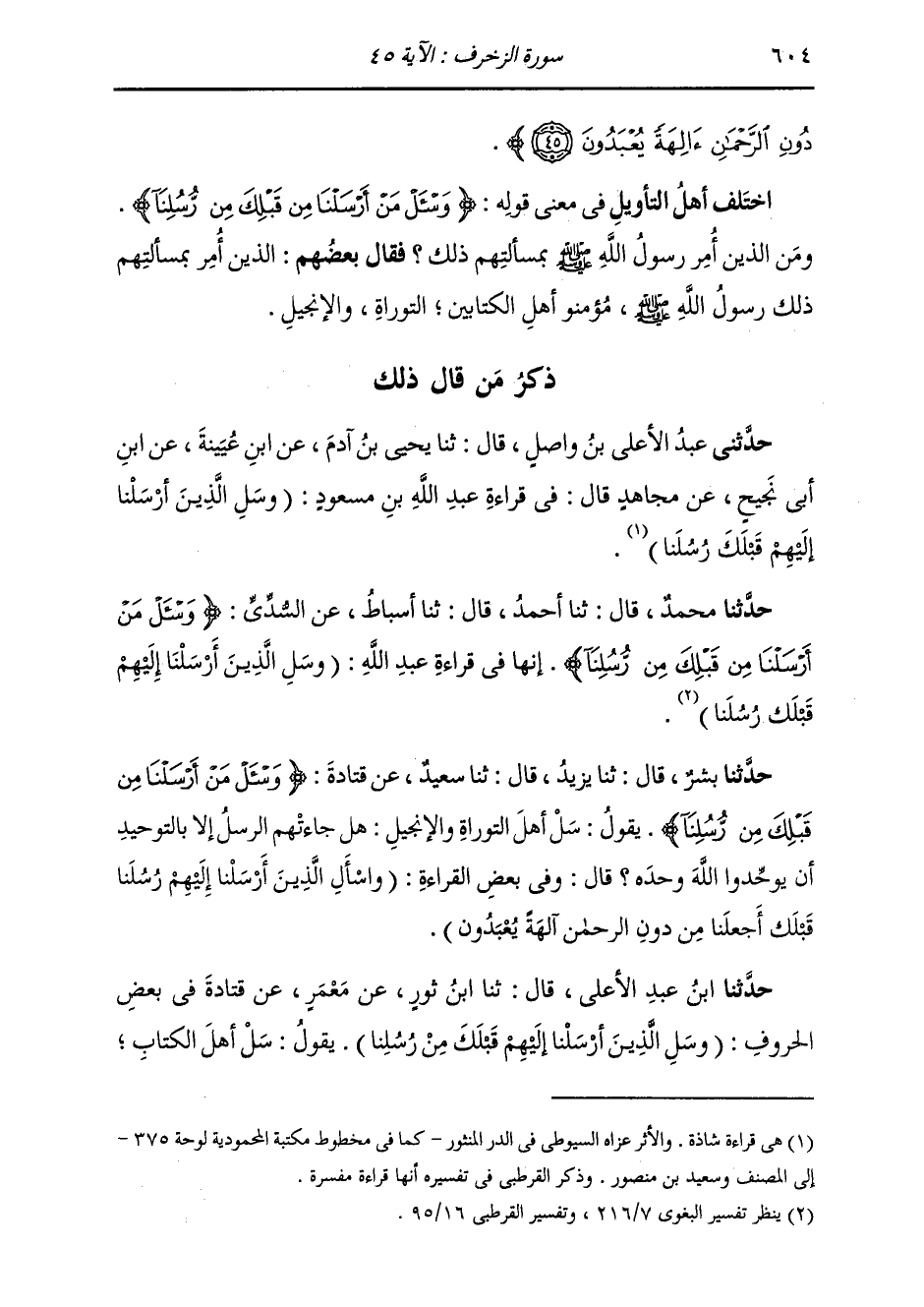 حَدَّثَنَا ابْنُ عَبْدِ الْأَعْلَى قَالَ: ثَنَا ابْنُ ثَوْرٍ، عَنْ مَعْمَرٍ، عَنْ قَتَادَةَ «§فِي بَعْضِ الْحُرُوفِ» وَاسْأَلِ الَّذِينَ أَرْسَلْنَا إِلَيْهِمْ قَبْلَكَ مِنْ رُسُلِنَا " سَلْ أَهْلَ الْكِتَابِ: -[605]- أَمَا كَانَتِ الرُّسُلُ تَأْتِيهِمْ بِالتَّوْحِيدِ؟ أَمَا كَانَتْ تَأْتِي بِالْإِخْلَاصِ؟