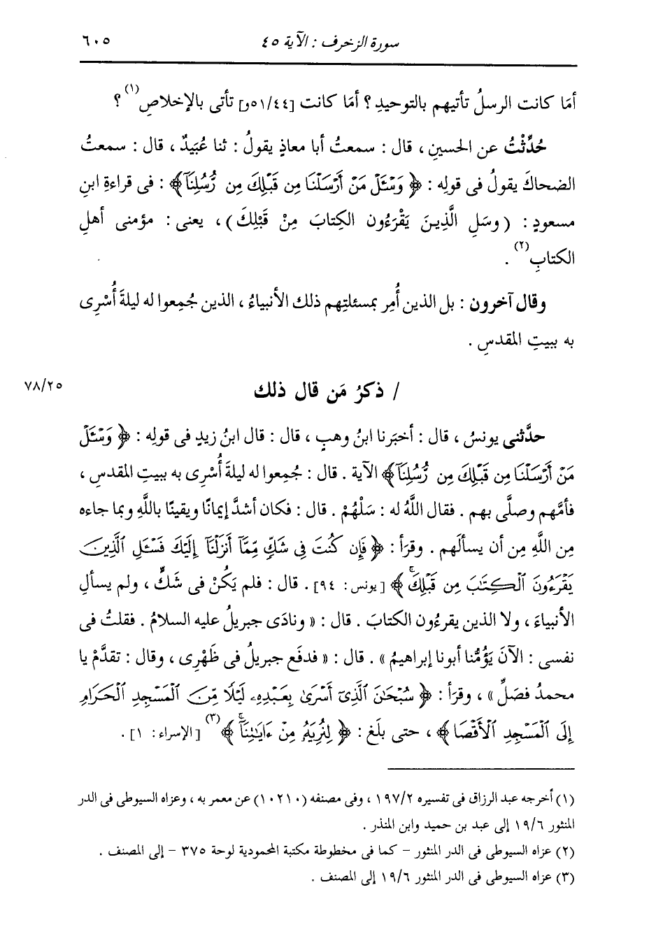 ذِكْرُ مَنْ قَالَ ذَلِكَ: حَدَّثَنِي يُونُسُ قَالَ: أَخْبَرَنَا ابْنُ وَهْبٍ قَالَ: قَالَ ابْنُ زَيْدٍ، فِي قَوْلِهِ: {§وَاسْأَلْ مَنْ أَرْسَلْنَا مِنْ قَبْلِكَ} [الزخرف: 45] الْآيَةَ قَالَ: " جُمِعُوا لَهُ لَيْلَةَ أُسْرِيَ بِهِ بِبَيْتِ الْمَقْدِسِ، فَأَمَّهُمْ، وَصَلَّى بِهِمْ، فَقَالَ اللَّهُ لَهُ: سَلْهُمْ قَالَ: فَكَانَ أَشَدَّ إِيمَانًا وَيَقِينًا بِاللَّهِ وَبِمَا جَاءَ مِنَ اللَّهِ أَنْ يَسْأَلَهُمْ، وَقَرَأَ {فَإِنْ كُنْتَ فِي شَكٍّ مِمَّا أَنْزَلْنَا إِلَيْكَ فَاسْأَلِ الَّذِينَ يَقْرَءُونَ الْكِتَابَ مِنْ قَبْلِكَ} قَالَ: فَلَمْ يَكُنْ فِي شَكٍّ، وَلَمْ يَسْأَلِ الْأَنْبِيَاءَ، وَلَا الَّذِينَ يَقْرَأُونَ الْكِتَابَ قَالَ: وَنَادَى جِبْرَائِيلُ صَلَّى اللهُ عَلَيْهِ وَسَلَّمَ، فَقُلْتُ فِي نَفْسِي: الْآنَ يَؤُمُّنَا أَبُونَا إِبْرَاهِيمُ؛ قَالَ: فَدَفَعَ جِبْرَائِيلُ فِي ظَهْرِي قَالَ: تَقَدَّمْ يَا مُحَمَّدُ فَصَلِّ، وَقَرَأَ {سُبْحَانَ الَّذِي أَسْرَى بِعَبْدِهِ لَيْلًا مِنَ الْمَسْجِدِ الْحَرَامِ} [الإسراء: 1] حَتَّى بَلَغَ {لِنُرِيَهُ مِنْ آيَاتِنَا} [الإسراء: 1] "