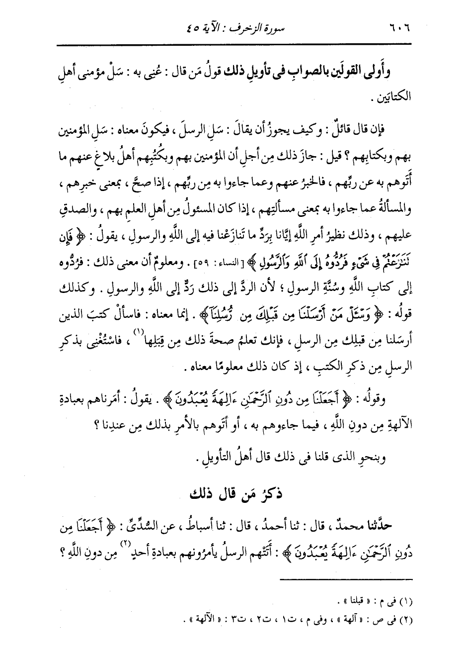 ذِكْرُ مَنْ قَالَ ذَلِكَ: حَدَّثَنَا مُحَمَّدٌ قَالَ: ثَنَا أَحْمَدُ قَالَ: ثَنَا أَسْبَاطُ، عَنِ السُّدِّيِّ، {§أَجَعَلْنَا مِنْ دُونِ الرَّحْمَنِ آلِهَةً يُعْبَدُونَ} [الزخرف: 45] «أَتَتْهُمُ الرُّسُلُ يَأْمُرُونَهُمْ بِعِبَادَةِ الْآلِهَةِ مِنْ دُونِ اللَّهِ؟» -[607]- وَقِيلَ: {آلِهَةً يُعْبَدُونَ} [الزخرف: 45] ، فَأَخْرَجَ الْخَبَرَ عَنِ الْآلِهَةِ مَخْرَجَ الْخَبَرِ عَنْ ذُكُورِ بَنِي آدَمَ، وَلَمْ يَقُلْ: تُعْبَدُ، وَلَا يُعْبَدْنَ، فَتُؤَنَّثُ وَهِيَ حِجَارَةٌ، أَوْ بَعْضُ الْجَمَادِ كَمَا يَفْعَلُ فِي الْخَبَرِ عَنْ بَعْضِ الْجَمَادِ وَإِنَّمَا فَعَلَ ذَلِكَ كَذَلِكَ، إِذْ كَانَتْ تُعْبَدُ وَتُعَظَّمُ تَعْظِيمَ النَّاسِ مُلُوكَهُمْ وَسَرَاتَهُمْ، فَأَجْرَى الْخَبَرَ عَنْهَا مَجْرَى الْخَبَرِ عَنِ الْمُلُوكِ وَالْأَشْرَافِ مِنْ بَنِي آدَمَ