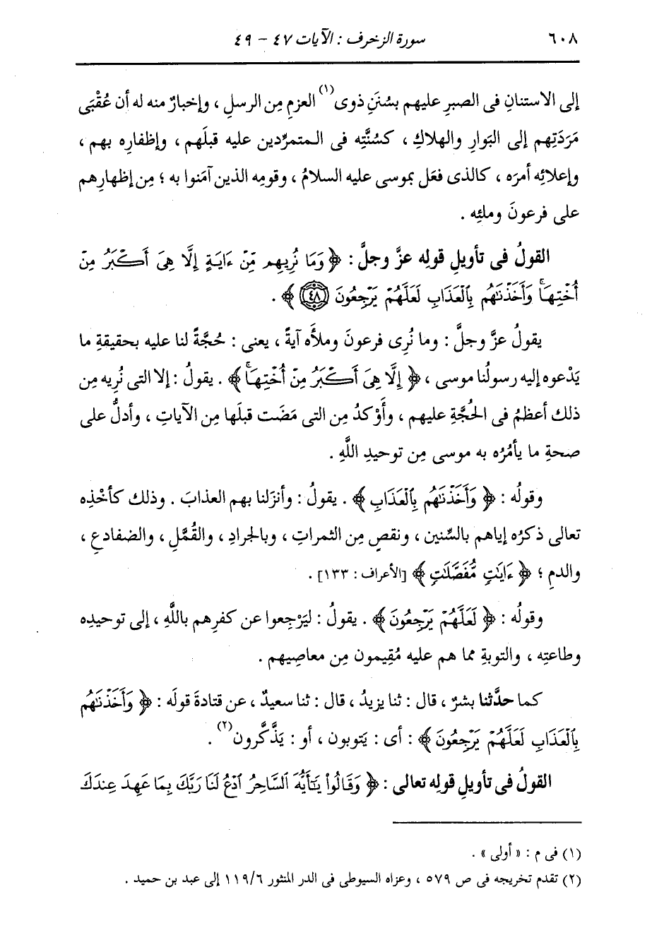 §الْقَوْلُ فِي تَأْوِيلِ قَوْلِهِ تَعَالَى: {وَمَا نُرِيهِمْ مِنْ آيَةٍ إِلَّا هِيَ أَكْبَرُ مِنْ أُخْتِهَا وَأَخَذْنَاهُمْ بِالْعَذَابِ لَعَلَّهُمْ يَرْجِعُونَ} [الزخرف: 48] يَقُولُ تَعَالَى ذِكْرُهُ: وَمَا نُرِي فِرْعَوْنَ وَمَلَأَهُ آيَةً، يَعْنِي: حُجَّتَهُ لَنَا عَلَيْهِ بِحَقِيقَةِ مَا يَدْعُوهُ إِلَيْهِ رَسُولُنَا مُوسَى {إِلَّا هِيَ أَكْبَرُ مِنْ أُخْتِهَا} [الزخرف: 48] يَقُولُ: إِلَّا الَّتِي نُرِيهِ مِنْ ذَلِكَ أَعْظَمُ فِي الْحُجَّةِ عَلَيْهِمْ وَأَوْكَدُ مِنَ الَّتِي مَضَتْ قَبْلَهَا مِنَ الْآيَاتِ، وَأَدَلُّ عَلَى صِحَّةِ مَا يَأْمُرُهُ بِهِ مُوسَى مِنْ تَوْحِيدِ اللَّهِ