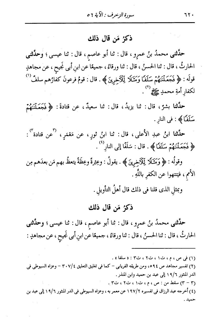 ذِكْرُ مَنْ قَالَ ذَلِكَ: حَدَّثَنِي مُحَمَّدُ بْنُ عَمْرٍو قَالَ: ثَنَا أَبُو عَاصِمٍ قَالَ: ثَنَا عِيسَى، وَحَدَّثَنِي الْحَارِثُ قَالَ: ثَنَا الْحَسَنُ قَالَ: ثَنَا وَرْقَاءُ، جَمِيعًا، عَنِ ابْنِ أَبِي نَجِيحٍ، عَنْ مُجَاهِدٍ، قَوْلَهُ: {§فَجَعَلْنَاهُمْ سَلَفًا وَمَثَلًا لِلْآخَرِينَ} [الزخرف: 56] قَالَ: «قَوْمُ فِرْعَوْنَ كُفَّارُهُمْ سَلَفًا لِكُفَّارِ أُمَّةِ مُحَمَّدٍ صَلَّى اللهُ عَلَيْهِ وَسَلَّمَ»
