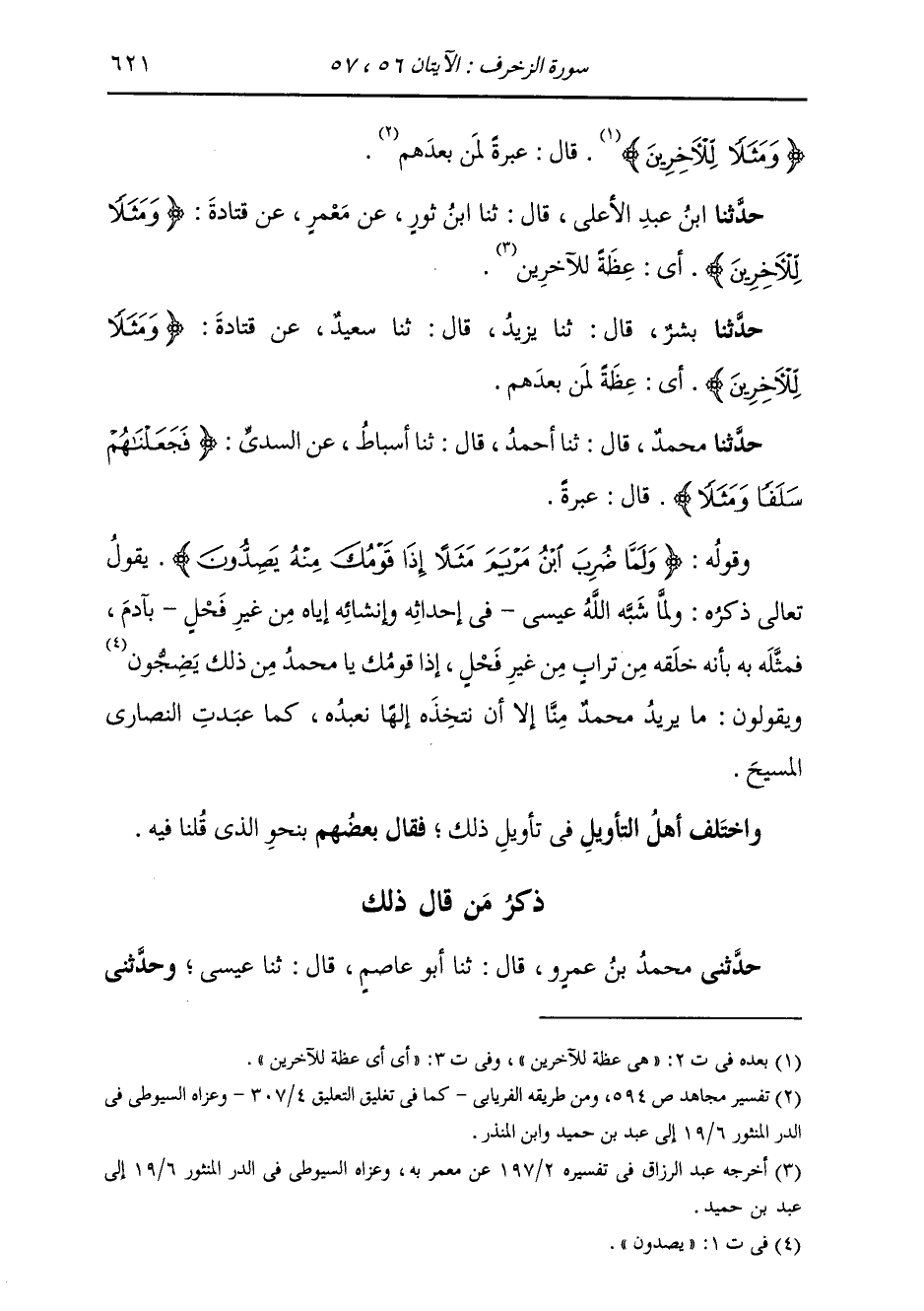 حَدَّثَنَا ابْنُ عَبْدِ الْأَعْلَى قَالَ: ثَنَا ابْنُ ثَوْرٍ، عَنْ مَعْمَرٍ، عَنْ قَتَادَةَ، {§وَمَثَلًا لِلْآخِرِينَ} [الزخرف: 56] «أَيْ عِظَةً لِلْآخِرِينَ»