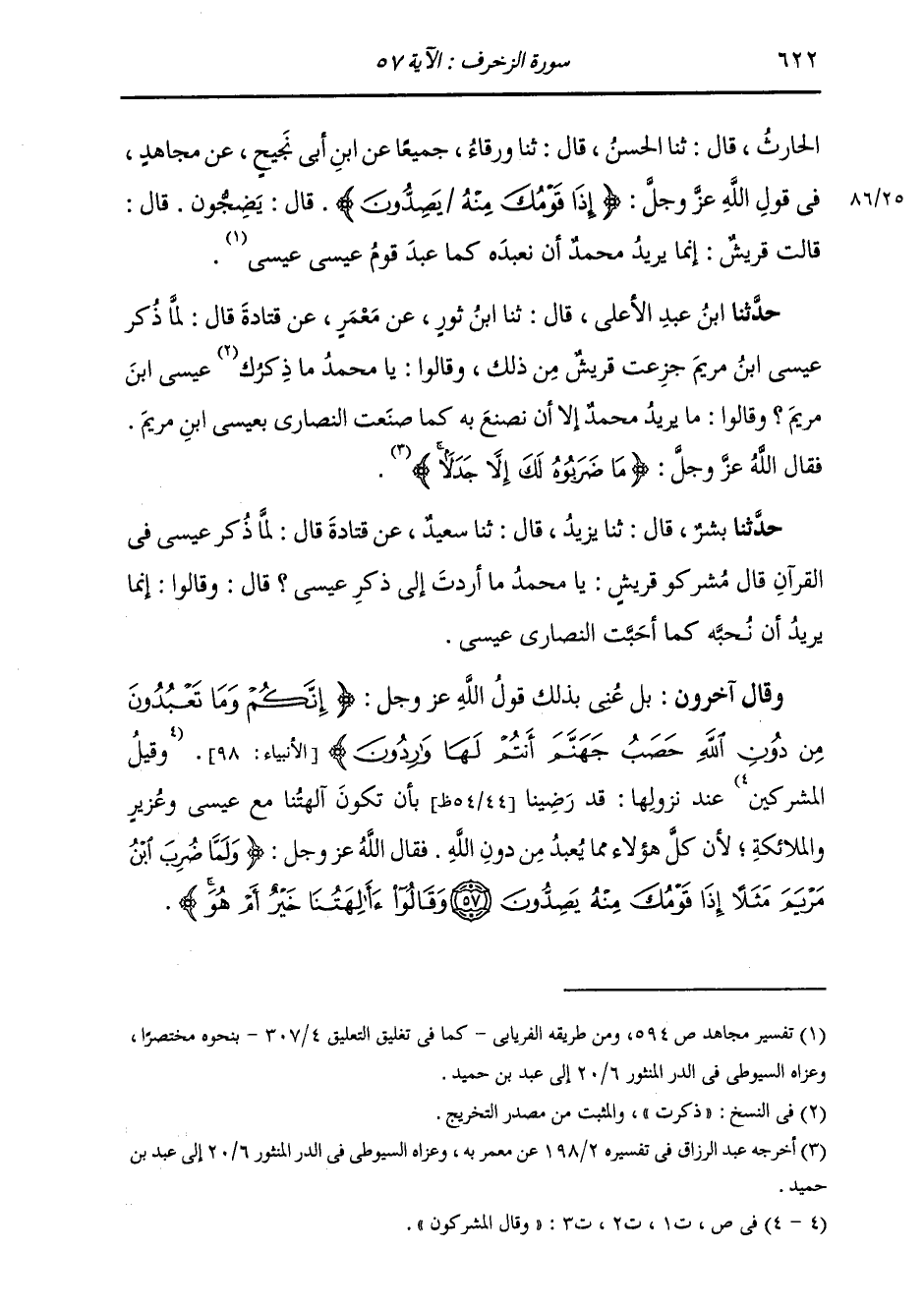 حَدَّثَنَا ابْنُ عَبْدِ الْأَعْلَى قَالَ: ثَنَا ابْنُ ثَوْرٍ، عَنْ مَعْمَرٍ، عَنْ قَتَادَةَ قَالَ: " لَمَّا §ذُكِرَ عِيسَى ابْنُ مَرْيَمَ جَزَعَتْ قُرَيْشٌ مِنْ ذَلِكَ، وَقَالُوا: يَا مُحَمَّدُ مَا ذَكَرْتَ عِيسَى ابْنَ مَرْيَمَ، وَقَالُوا: مَا يُرِيدُ مُحَمَّدٌ إِلَّا أَنْ نَصْنَعَ بِهِ كَمَا صَنَعْتِ النَّصَارَى بِعِيسَى ابْنِ مَرْيَمَ، فَقَالَ اللَّهُ عَزَّ وَجَلَّ: {مَا ضَرَبُوهُ لَكَ إِلَّا جَدَلًا} [الزخرف: 58] "