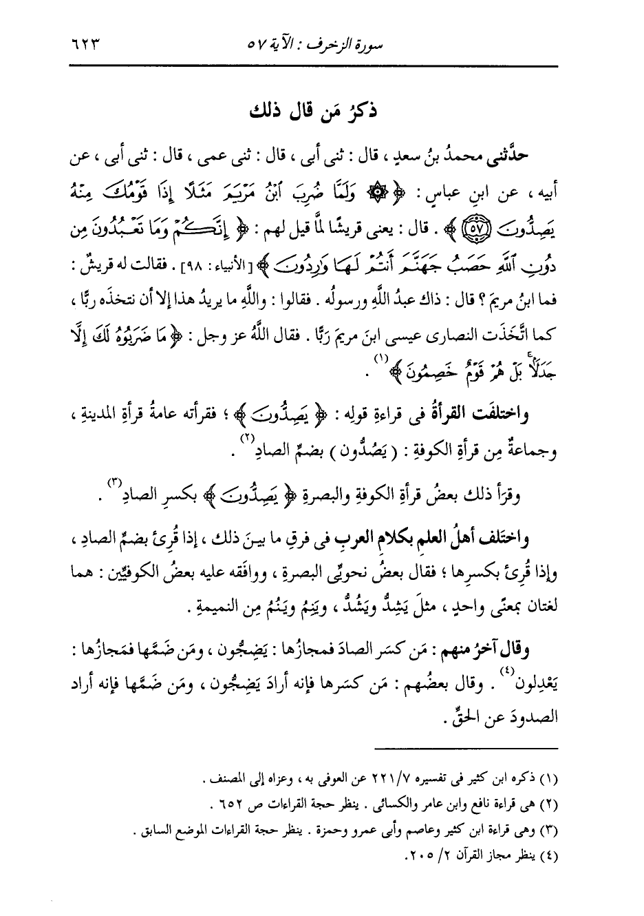 ذِكْرُ مَنْ قَالَ ذَلِكَ: حَدَّثَنِي مُحَمَّدُ بْنُ سَعْدٍ، ثَنَي أَبِي قَالَ، ثَنِي عَمِّي قَالَ: ثَنِي أَبِي، عَنْ أَبِيهِ، عَنِ ابْنِ عَبَّاسٍ: {§وَلَمَّا ضُرِبَ ابْنُ مَرْيَمَ مَثَلًا إِذَا قَوْمُكَ مِنْهُ يَصِدُّونَ} [الزخرف: 57] قَالَ: يَعْنِي قُرَيْشًا لَمَّا قِيلَ لَهُمْ {إِنَّكُمْ وَمَا تَعْبُدُونَ مِنْ دُونِ اللَّهِ حَصَبُ جَهَنَّمَ أَنْتُمْ لَهَا وَارِدُونَ} [الأنبياء: 98] فَقَالَتْ لَهُ قُرَيْشٌ: فَمَا ابْنُ مَرْيَمَ؟ قَالَ: «ذَاكَ عَبْدُ اللَّهِ وَرَسُولُهُ» ، فَقَالُوا: وَاللَّهِ مَا يُرِيدُ هَذَا إِلَّا أَنْ نَتَّخِذَهُ رَبًّا كَمَا اتَّخَذَتِ النَّصَارَى عِيسَى ابْنَ مَرْيَمَ رَبًّا، فَقَالَ اللَّهُ عَزَّ وَجَلَّ: {مَا ضَرَبُوهُ لَكَ إِلَّا جَدَلًا بَلْ هُمْ قَوْمٌ خَصِمُونَ} [الزخرف: 58] " وَاخْتَلَفَتِ الْقُرَّاءُ فِي قِرَاءَةِ قَوْلِهِ: {يَصِدُّونَ} [النساء: 61] فَقَرَأَتْهُ عَامَّةُ قُرَّاءِ الْمَدِينَةِ، وَجَمَاعَةٌ مِنْ قُرَّاءِ الْكُوفَةِ: (يَصُدُّونَ) بضَمِّ الصَّادِ وَقَرَأَ ذَلِكَ بَعْضُ قُرَّاءِ الْكُوفَةِ وَالْبَصْرَةِ {يَصِدُّونَ} [النساء: 61] بِكَسْرِ الصَّادِ وَاخْتَلَفَ أَهْلُ الْعِلْمِ بِكَلَامِ الْعَرَبِ فِي فَرْقِ مَا بَيْنَ ذَلِكَ إِذَا قُرِئَ بِضَمِّ الصَّادِ، وَإِذَا قُرِئَ بِكَسْرِهَا، فَقَالَ بَعْضُ نَحْوِيِّي الْبَصْرَةِ، وَوَافَقَهُ عَلَيْهِ بَعْضُ الْكُوفِيِّينَ: هُمَا لُغَتَانِ بِمَعْنًى وَاحِدٍ، مِثْلَ يَشُدُّ وَيَشِدُّ، وَيَنُمُّ وَيَنِمُّ مِنَ النَّمِيمَةِ وَقَالَ آخَرُ مِنْهُمْ: مَنْ كَسَرَ الصَّادَ فَمَجَازُهَا يَضِجُّونَ، وَمَنْ ضَمَّهَا فَمَجَازُهَا يَعْدِلُونَ وَقَالَ بَعْضُ مَنْ كَسَرَهَا: فَإِنَّهُ أَرَادَ يَضِجُّونَ، وَمَنْ ضَمَّهَا فَإِنَّهُ أَرَادَ الصُّدُودَ عَنِ الْحَقِّ