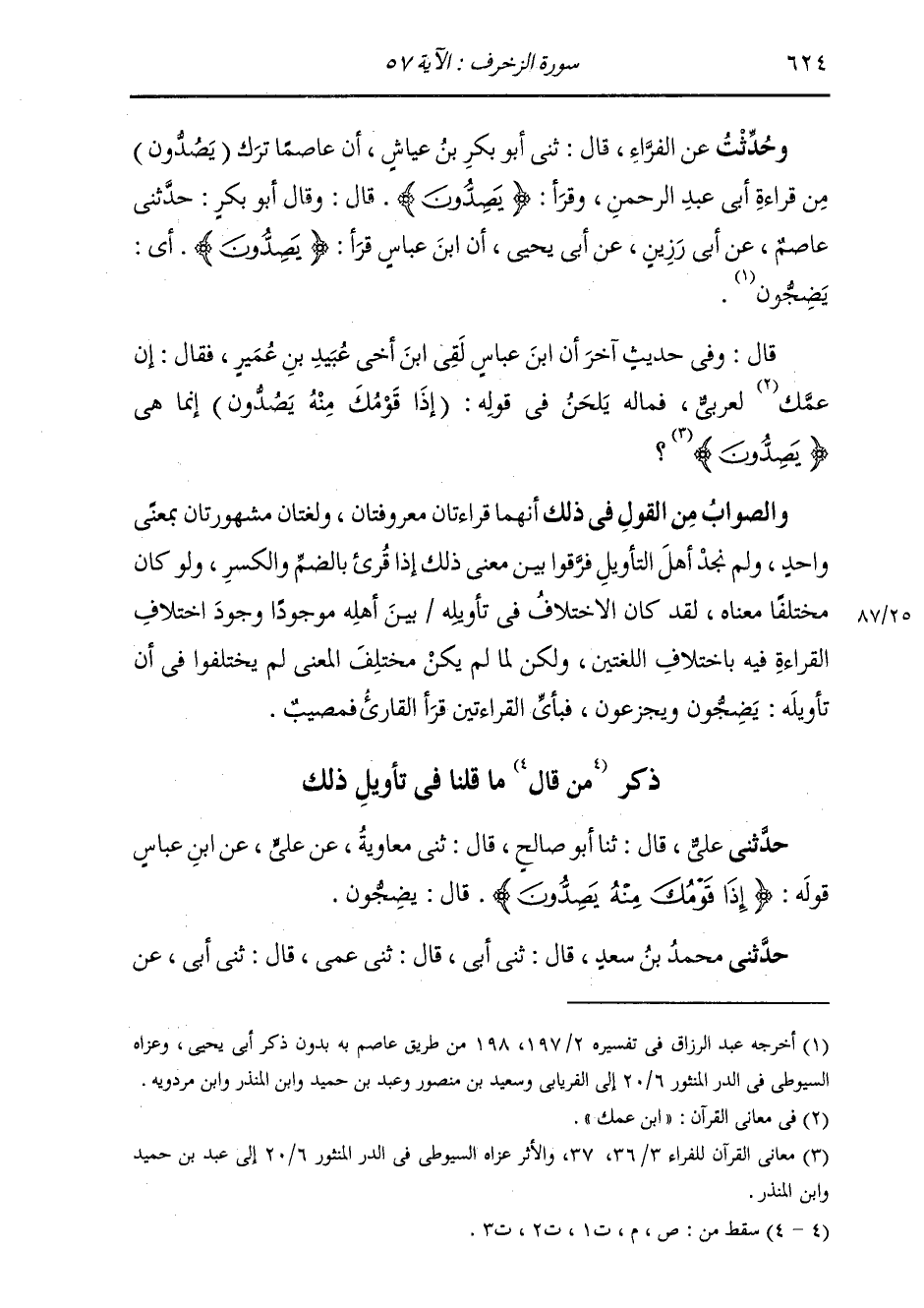 قَالَ: قَالَ أَبُو بَكْرٍ: حَدَّثَنِي عَاصِمٌ، عَنْ أَبِي رَزِينٍ، عَنْ أَبِي يَحْيَى، أَنَّ ابْنَ عَبَّاسٍ لَقِيَ ابْنَ أَخِي عُبَيْدِ بْنِ عُمَيْرٍ، فَقَالَ: " إِنَّ عَمَّكَ لَعَرَبِيُّ، فَمَا لَهُ يَلْحَنُ فِي قَوْلِهِ: «§إِذَا قَوْمُكَ مِنْهُ يَصُدُّونَ» ، وَإِنَّمَا هِيَ {يَصِدُّونَ} [النساء: 61] " وَالصَّوَابُ مِنَ الْقَوْلِ فِي ذَلِكَ أَنَّهُمَا قَرَاءَتَانِ مَعْرُوفَتَانِ، وَلُغَتَانِ مَشْهُورَتَانِ بِمَعْنًى وَاحِدٍ، وَلَمْ نَجِدْ أَهْلَ التَّأْوِيلِ فَرَّقُوا بَيْنَ مَعْنَى ذَلِكَ إِذَا قُرِئَ بِالضَّمِّ وَالْكَسْرِ، وَلَوْ كَانَ مُخْتَلِفًا مَعْنَاهُ، لَقَدْ كَانَ الِاخْتِلَافُ فِي تَأْوِيلِهِ بَيْنَ أَهْلِهِ مَوْجُودًا وُجُودَ اخْتِلَافِ الْقِرَاءَةِ فِيهِ بِاخْتِلَافِ اللُّغَتَيْنِ، وَلَكِنْ لَمَّا لَمْ يَكُنْ مُخْتَلِفَ الْمَعْنَى لَمْ يَخْتَلِفُوا فِي أَنَّ تَأْوِيلَهُ: يَضِجُّونَ وَيَجْزَعُونَ، فَبِأَيِّ الْقِرَاءَتَيْنِ قَرَأَ الْقَارِئُ فَمُصِيبٌ