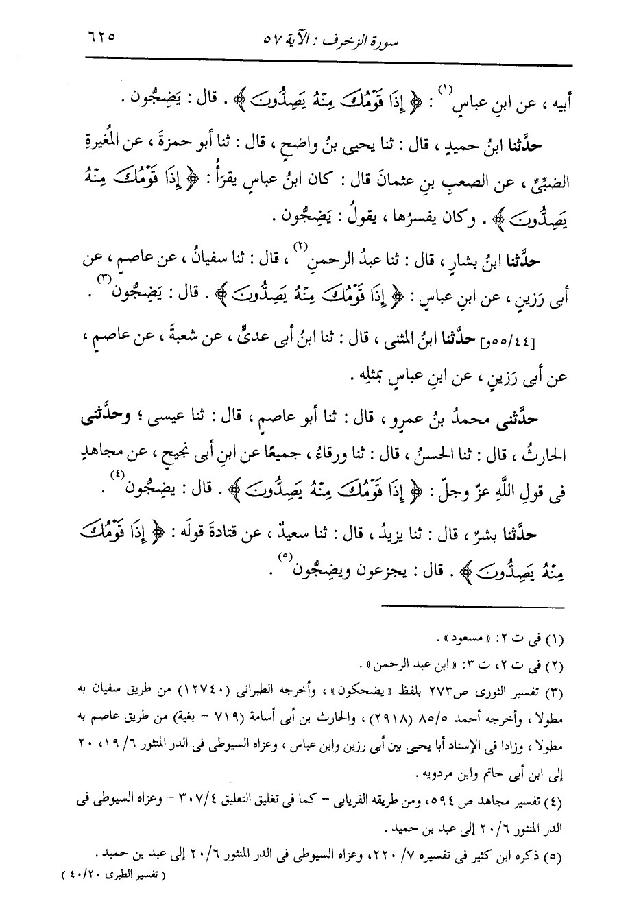 حَدَّثَنَا ابْنُ بَشَّارٍ قَالَ: ثَنَا عَبْدُ الرَّحْمَنِ قَالَ: ثَنَا سُفْيَانُ، عَنْ عَاصِمٍ، عَنْ أَبِي رَزِينٍ، عَنِ ابْنِ عَبَّاسٍ {§إِذَا قَوْمُكَ مِنْهُ يَصِدُّونَ} [الزخرف: 57] قَالَ: «يَضِجُّونَ» حَدَّثَنَا ابْنُ الْمُثَنَّى قَالَ: ثَنَا ابْنُ أَبِي عَدِيٍّ، عَنْ شُعْبَةَ عَنْ عَاصِمٍ عَنْ أَبِي رَزِينٍ، عَنِ ابْنِ عَبَّاسٍ بِمِثْلِهِ
