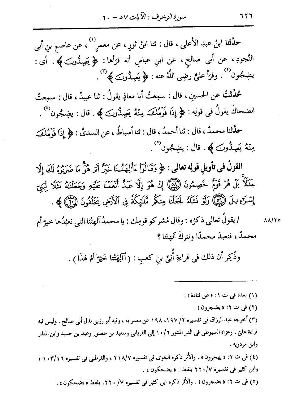 حَدَّثَنَا ابْنُ عَبْدِ الْأَعْلَى قَالَ: ثَنَا ابْنُ ثَوْرٍ، عَنْ مَعْمَرٍ، عَنْ عَاصِمِ بْنِ أَبِي النَّجُودِ، عَنْ أَبِي صَالِحٍ، عَنِ ابْنِ عَبَّاسٍ أَنَّهُ قَرَأَهَا {§يَصِدُّونَ} [النساء: 61] أَيْ " يَضِجُّونَ، وَقَرَأَ عَلِيُّ رَضِيَ اللَّهُ عَنْهُ {يَصِدُّونَ} [النساء: 61] "