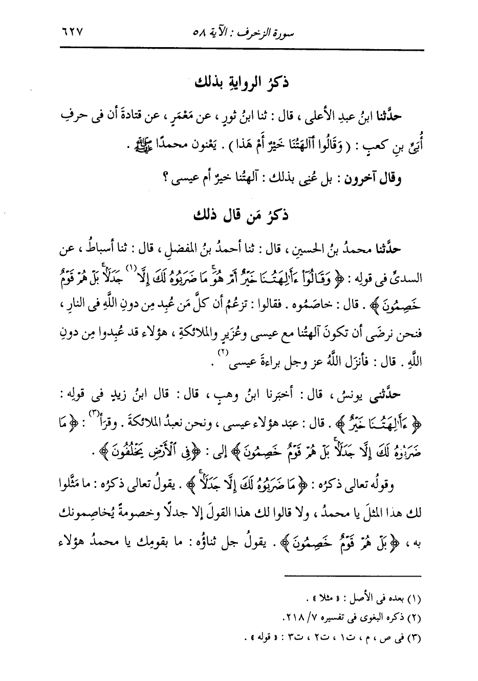 ذِكْرُ مَنْ قَالَ ذَلِكَ: حَدَّثَنَا مُحَمَّدُ بْنُ الْحُسَيْنِ قَالَ: ثَنَا أَحْمَدُ بْنُ الْمُفَضَّلِ قَالَ: ثَنَا أَسْبَاطُ، عَنِ السُّدِّيِّ، فِي قَوْلِهِ: {§وَقَالُوا أَآلِهَتُنَا خَيْرٌ أَمْ هُوَ مَا ضَرَبُوهُ لَكَ إِلَّا جَدَلًا بَلْ هُمْ قَوْمٌ خَصِمُونَ} [الزخرف: 58] قَالَ: «خَاصَمُوهُ» ، فَقَالُوا: يَزْعُمُ أَنَّ كُلَّ مَنْ عُبِدَ مِنْ دُونِ اللَّهِ فِي النَّارِ، فَنَحْنُ نَرْضَى أَنْ تَكُونَ آلِهَتُنَا مَعَ عِيسَى وَعُزَيْرٍ وَالْمَلَائِكَةِ هَؤُلَاءِ قَدْ عُبِدُوا مِنْ دُونِ اللَّهِ قَالَ: «فَأَنْزَلَ اللَّهُ بَرَاءَةَ عِيسَى»