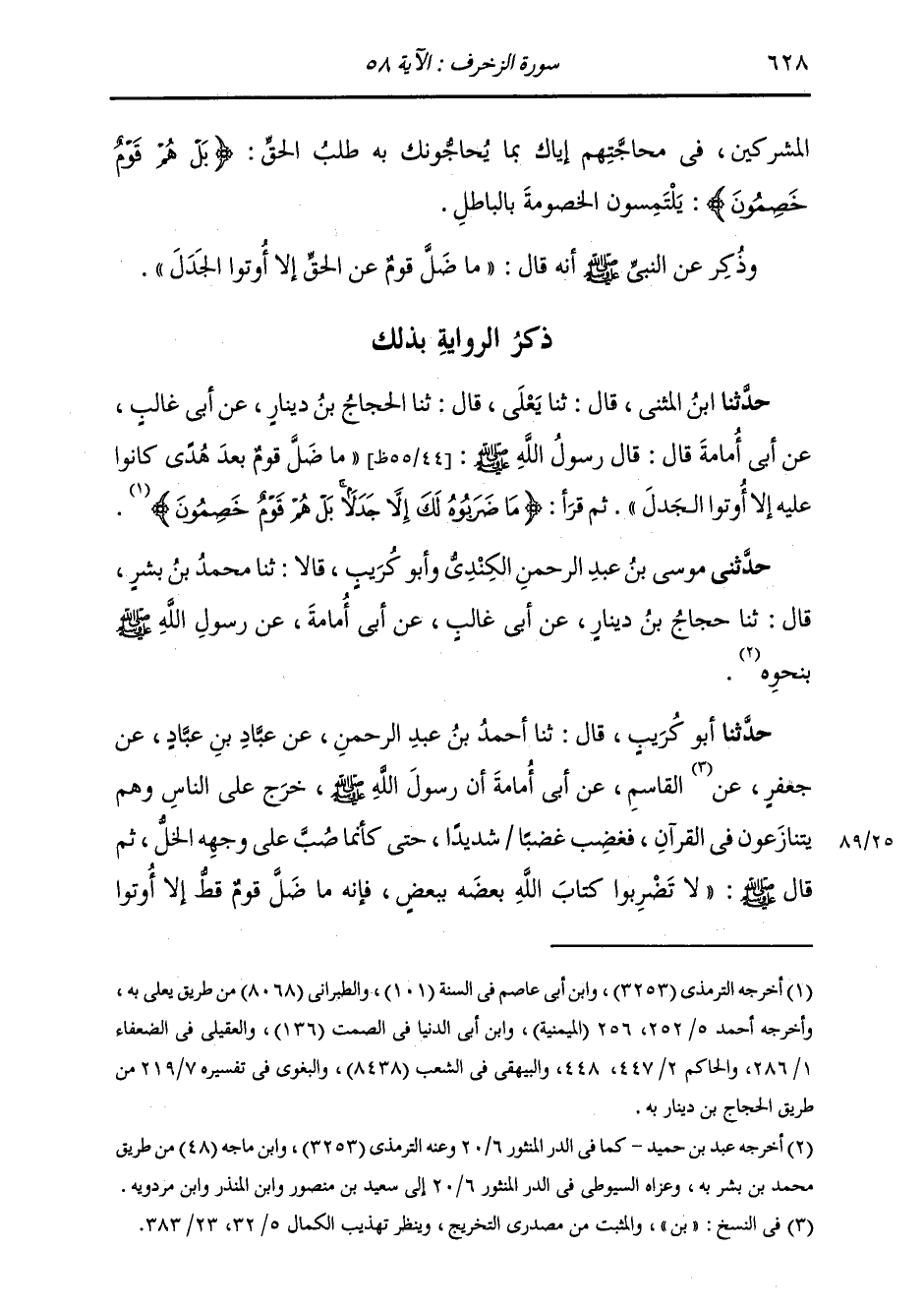 ذِكْرُ الرِّوَايَةِ بِذَلِكَ: حَدَّثَنَا ابْنُ الْمُثَنَّى قَالَ: ثَنَا يَعْلَى قَالَ: ثَنَا الْحَجَّاجُ بْنُ دِينَارٍ، عَنْ أَبِي غَالِبٍ، عَنْ أَبِي أُمَامَةَ قَالَ: قَالَ رَسُولُ اللَّهِ صَلَّى اللهُ عَلَيْهِ وَسَلَّمَ: «§مَا ضَلَّ قَوْمٌ بَعْدَ هُدًى كَانُوا عَلَيْهِ إِلَّا أُوتُوا الْجَدَلَ» وَقَرَأَ: {مَا ضَرَبُوهُ لَكَ إِلَّا جَدَلًا} [الزخرف: 58] الْآيَةَ حَدَّثَنِي مُوسَى بْنُ عَبْدِ الرَّحْمَنِ الْكِنْدِيُّ وَأَبُو كُرَيْبٍ قَالَا: ثَنَا مُحَمَّدُ بْنُ بِشْرٍ قَالَ: ثَنَا حَجَّاجُ بْنُ دِينَارٍ، عَنْ أَبِي غَالِبٍ، عَنْ أَبِي أُمَامَةَ، عَنْ رَسُولِ اللَّهِ صَلَّى اللهُ عَلَيْهِ وَسَلَّمَ بِنَحْوِهِ