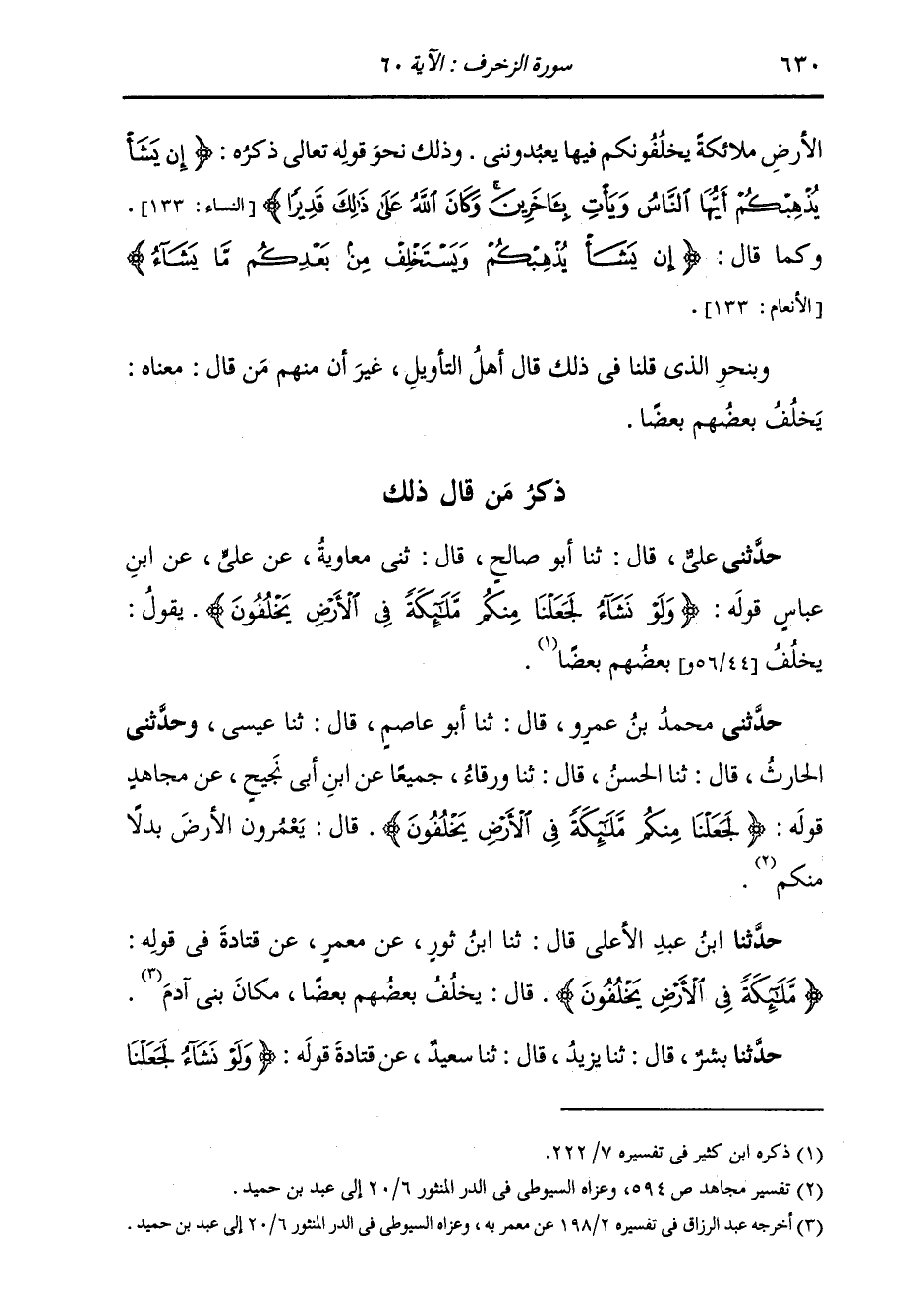 ذِكْرُ مَنْ قَالَ ذَلِكَ: حَدَّثَنِي عَلِيُّ قَالَ: ثَنَا أَبُو صَالِحٍ قَالَ: ثَنِي مُعَاوِيَةُ، عَنْ عَلِيٍّ، عَنِ ابْنِ عَبَّاسٍ، قَوْلَهُ: {§وَلَوْ نَشَاءُ لَجَعَلْنَا مِنْكُمْ مَلَائِكَةً فِي الْأَرْضِ يَخْلُفُونَ} [الزخرف: 60] يَقُولُ: «يَخْلُفُ بَعْضُهُمْ بَعْضًا»