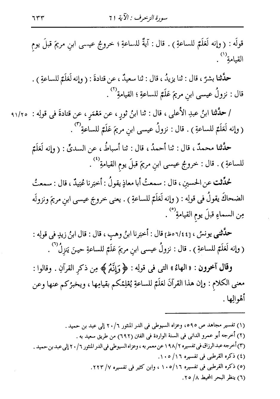 حَدَّثَنِي يُونُسُ قَالَ: أَخْبَرَنَا ابْنُ وَهْبٍ قَالَ: قَالَ ابْنُ زَيْدٍ، فِي قَوْلِهِ: {§وَإِنَّهُ لَعِلْمٌ لِلسَّاعَةِ} [الزخرف: 61] قَالَ: «نُزُولُ عِيسَى ابْنِ مَرْيَمَ عِلْمٌ لِلسَّاعَةِ حِينَ يَنْزِلُ» وَقَالَ آخَرُونَ: الْهَاءُ الَّتِي فِي قَوْلِهِ: {وَإِنَّهُ} [الزخرف: 61] مِنْ ذِكْرِ الْقُرْآنِ، وَقَالُوا: مَعْنَى الْكَلَامِ: وَإِنَّ هَذَا الْقُرْآنَ لَعِلْمٌ لِلسَّاعَةِ يُعْلِمُكُمْ بِقِيَامِهَا، وَيُخْبِرُكُمْ عَنْهَا وَعَنْ أَهْوَالِهَا