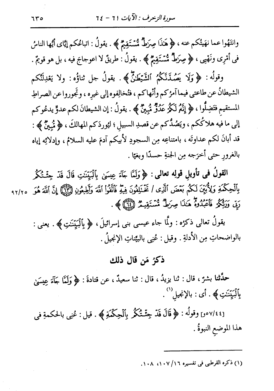 ذِكْرُ مَنْ قَالَ ذَلِكَ: حَدَّثَنَا بِشْرٌ قَالَ: ثَنَا يَزِيدُ قَالَ: ثَنَا سَعِيدٌ، عَنْ قَتَادَةَ، {§وَلَمَّا جَاءَ عِيسَى بِالْبَيِّنَاتِ} [الزخرف: 63] «أَيْ بِالْإِنْجِيلِ»