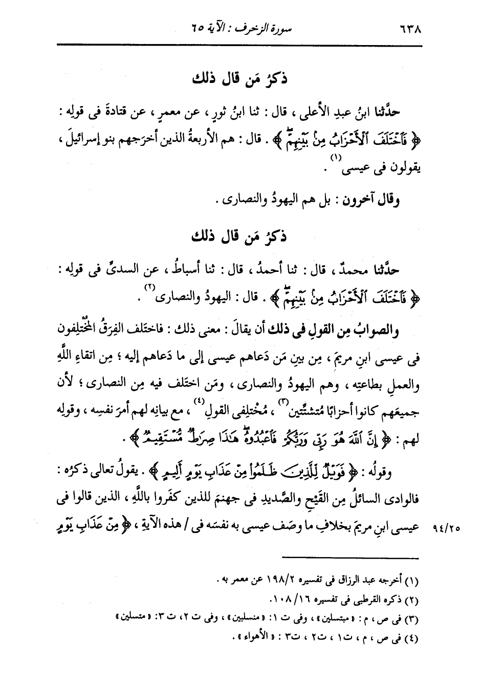 ذِكْرُ مَنْ قَالَ ذَلِكَ: حَدَّثَنَا ابْنُ عَبْدِ الْأَعْلَى قَالَ: ثَنَا ابْنُ ثَوْرٍ، عَنْ مَعْمَرٍ، عَنْ قَتَادَةَ، فِي قَوْلِهِ: {§فَاخْتَلَفَ الْأَحْزَابُ مِنْ بَيْنِهِمْ} [مريم: 37] قَالَ: «هُمُ الْأَرْبَعَةُ الَّذِينَ أَخْرَجَهُمْ بَنُو إِسْرَائِيلَ يَقُولُونَ فِي عِيسَى» وَقَالَ آخَرُونَ: بَلْ هُمُ الْيَهُودُ وَالنَّصَارَى