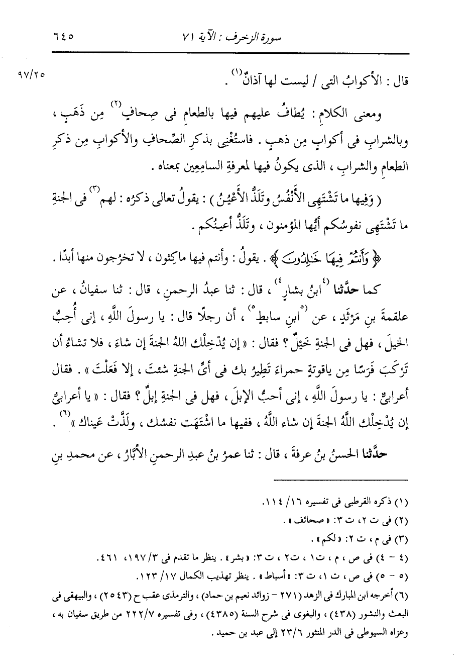 كَمَا: حَدَّثَنَا بِشْرٌ قَالَ: ثَنَا عَبْدُ الرَّحْمَنِ قَالَ: ثَنَا سُفْيَانُ، عَنْ عَلْقَمَةَ بْنِ مَرْثَدٍ، عَنِ ابْنِ سَابِطٍ، أَنَّ رَجُلًا قَالَ: يَا رَسُولَ اللَّهِ إِنِّي أُحِبُّ الْخَيْلَ، فَهَلْ فِي الْجَنَّةِ خَيْلٌ؟ فَقَالَ: «§إِنْ يُدْخِلْكَ الْجَنَّةَ إِنْ شَاءَ، فَلَا تَشَاءُ أَنْ تَرْكَبَ فَرَسًا مِنْ يَاقُوتَةٍ حَمْرَاءَ تَطِيرُ بِكَ فِي أَيِّ الْجَنَّةِ شِئْتَ إِلَّا فَعَلْتَ» ، فَقَالَ أَعْرَابِيُّ: يَا رَسُولَ اللَّهِ إِنِّي أُحِبُّ الْإِبِلَ، فَهَلْ فِي الْجَنَّةِ إِبِلٌ؟ فَقَالَ: «يَا أَعْرَابِيُّ إِنْ يُدْخِلْكَ اللَّهُ الْجَنَّةَ إِنْ شَاءَ اللَّهُ، فَفِيهَا مَا اشْتَهَتْ نَفْسُكَ، وَلَذَّتْ عَيْنَاكَ»