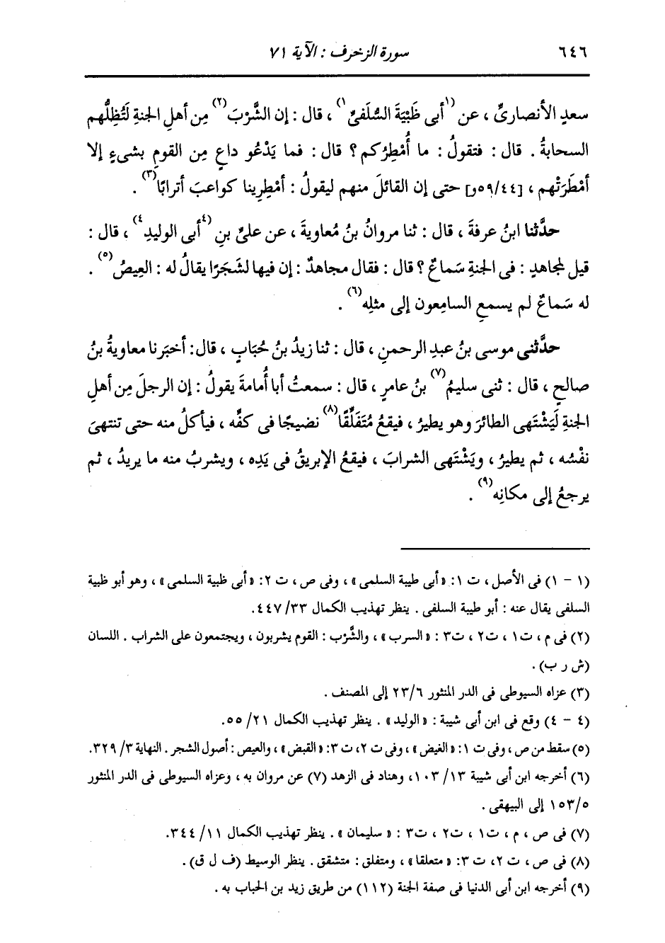 حَدَّثَنِي مُوسَى بْنُ عَبْدِ الرَّحْمَنِ قَالَ: ثَنَا زَيْدُ بْنُ حُبَابٍ قَالَ: أَخْبَرَنَا مُعَاوِيَةُ بْنُ صَالِحٍ قَالَ: ثَنِي سُلَيْمَانُ بْنُ عَامِرٍ قَالَ: سَمِعْتُ أَبَا أُمَامَةَ، يَقُولُ: «إِنَّ §الرَّجُلَ مِنْ أَهْلِ الْجَنَّةِ لَيَشْتَهِي الطَّائِرَ وَهُوَ يَطِيرُ، فَيَقَعُ مُتَفَلِّقًا نَضِيجًا فِي كَفِّهِ، فَيَأْكُلُ مِنْهُ حَتَّى تَنْتَهِيَ نَفْسُهُ، ثُمَّ يَطِيرُ، وَيَشْتَهِي الشَّرَابَ، فَيَقَعُ الْإِبْرِيقُ فِي يَدِهِ، وَيَشْرَبُ مِنْهُ مَا يُرِيدُ، ثُمَّ يَرْجِعُ إِلَى مَكَانِهِ» -[647]- وَاخْتَلَفَتِ الْقُرَّاءُ فِي قِرَاءَةِ قَوْلِهِ: {وَفِيهَا مَا تَشْتَهِيهِ الْأَنْفُسُ} [الزخرف: 71] فَقَرَأَتْهُ عَامَّةُ قُرَّاءِ الْمَدِينَةِ وَالشَّامِ: مَا {تَشْتَهِيهِ} [الزخرف: 71] بِزِيَادَةِ هَاءٍ، وَكَذَلِكَ ذَلِكَ فِي مَصَاحِفِهِمْ وَقَرَأَ ذَلِكَ عَامَّةُ قُرَّاءِ الْعِرَاقِ (تَشْتَهِي) بِغَيْرِ هَاءٍ، وَكَذَلِكَ هُوَ فِي مَصَاحِفِهِمْ وَالصَّوَابُ مِنَ الْقَوْلِ فِي ذَلِكَ أَنَّهُمَا قِرَاءَتَانِ مَشْهُورَتَانِ بِمَعْنًى وَاحِدٍ، فَبِأَيَّتِهِمَا قَرَأَ الْقَارِئُ فَمُصِيبٌ