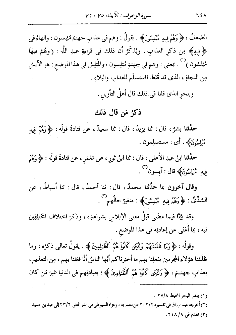 ذِكْرُ مَنْ قَالَ ذَلِكَ: حَدَّثَنَا بِشْرٌ قَالَ: ثَنَا يَزِيدُ قَالَ: ثَنَا سَعِيدٌ، عَنْ قَتَادَةَ، {§وَهُمْ فِيهِ مُبْلِسُونَ} [الزخرف: 75] أَيْ «مُسْتَسْلِمُونَ»