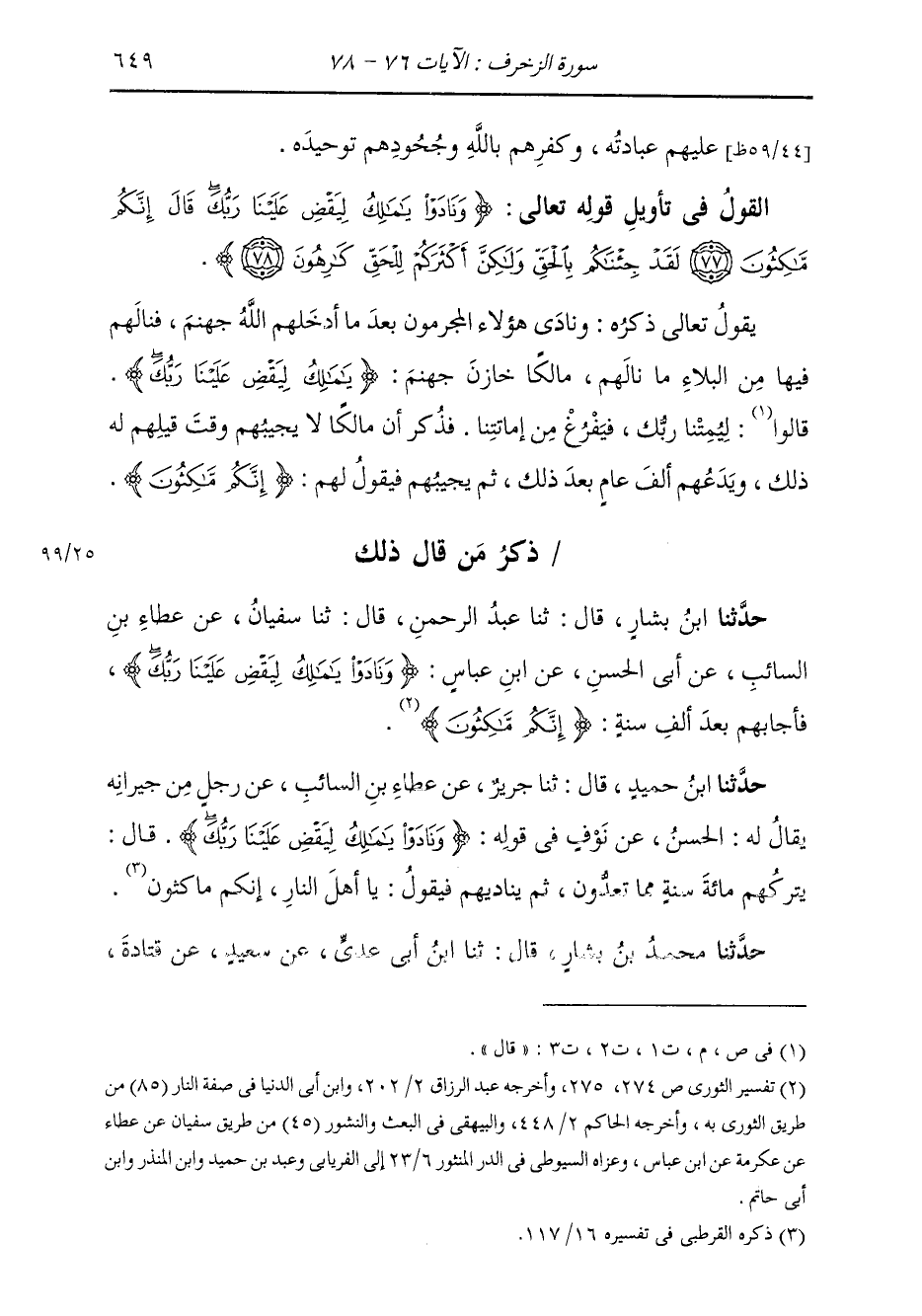 ذِكْرُ مَنْ قَالَ ذَلِكَ: حَدَّثَنَا ابْنُ بَشَّارٍ قَالَ: ثَنَا عَبْدُ الرَّحْمَنِ قَالَ: ثَنَا سُفْيَانُ، عَنْ عَطَاءِ بْنِ السَّائِبِ، عَنْ أَبِي الْحَسَنِ، عَنِ ابْنِ عَبَّاسٍ، {§وَنَادَوْا يَا مَالِكُ لِيَقْضِ عَلَيْنَا رَبُّكَ} [الزخرف: 77] " فَأَجَابَهُمْ بَعْدَ أَلْفَ سَنَةٍ {إِنَّكُمْ مَاكِثُونَ} [الزخرف: 77] "
