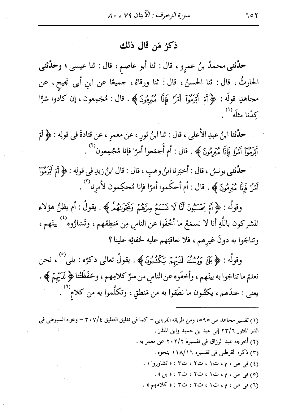 §وَقَوْلُهُ: {أَمْ يَحْسَبُونَ أَنَّا لَا نَسْمَعُ سِرَّهُمْ وَنَجْوَاهُمْ} [الزخرف: 80] يَقُولُ: أَمْ يَظُنُّ هَؤُلَاءِ الْمُشْرِكُونَ بِاللَّهِ أَنَّا لَا نَسْمَعُ مَا أَخْفَوْا عَنِ النَّاسِ مِنْ مَنْطِقِهِمْ، وَتَشَاوَرُوا بَيْنَهُمْ وَتَنَاجَوْا بِهِ دُونَ غَيْرِهِمْ، فَلَا نُعَاقِبُهُمْ عَلَيْهِ لِخَفَائِهِ عَلَيْنَا