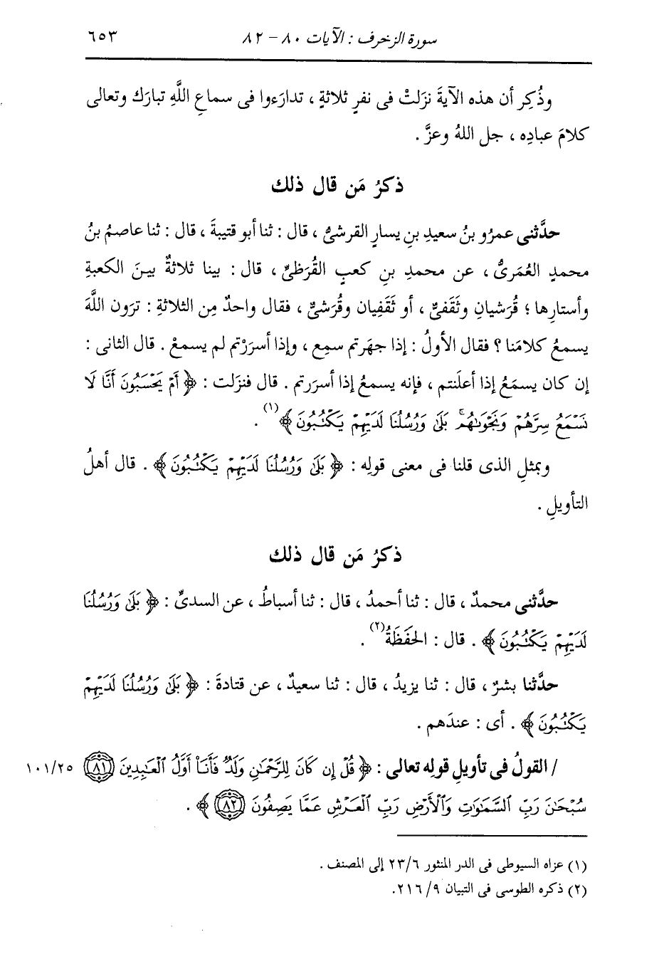 ذِكْرُ مَنْ قَالَ ذَلِكَ: حَدَّثَنِي عَمْرُو بْنُ سَعِيدِ بْنِ يَسَارٍ الْقُرَشِيُّ قَالَ: ثَنَا أَبُو قُتَيْبَةَ قَالَ: ثَنَا عَاصِمُ بْنُ مُحَمَّدٍ الْعُمَرِيُّ، عَنْ مُحَمَّدِ بْنِ كَعْبٍ الْقُرَظِيُّ قَالَ: " §بَيْنَا ثَلَاثَةٌ بَيْنَ الْكَعْبَةِ وَأَسْتَارِهَا، قُرَشِيَّانِ وَثَقَفِيُّ، أَوْ ثَقَفِيَّانِ وَقُرَشِيُّ، فَقَالَ وَاحِدٌ مِنَ الثَّلَاثَةِ: أَتَرَوْنَ اللَّهَ يَسْمَعُ كَلَامَنَا؟ فَقَالَ الْأَوَّلُ: إِذَا جَهَرْتُمْ سَمِعَ، وَإِذَا أَسْرَرْتُمْ لَمْ يَسْمَعْ قَالَ الثَّانِي: إِنْ كَانَ يَسْمَعُ إِذَا أَعْلَنْتُمْ، فَإِنَّهُ يَسْمَعُ إِذَا أَسْرَرْتُمْ قَالَ: فَنَزَلَتْ {أَمْ يَحْسَبُونَ أَنَّا لَا نَسْمَعُ سِرَّهُمْ وَنَجْوَاهُمْ بَلَى وَرُسُلُنَا لَدَيْهِمْ يَكْتُبُونَ} [الزخرف: 80] " وَبِنَحْوِ الَّذِي قُلْنَا فِي مَعْنَى قَوْلِهِ: {بَلَى وَرُسُلُنَا لَدَيْهِمْ يَكْتُبُونَ} [الزخرف: 80] قَالَ أَهْلُ التَّأْوِيلِ