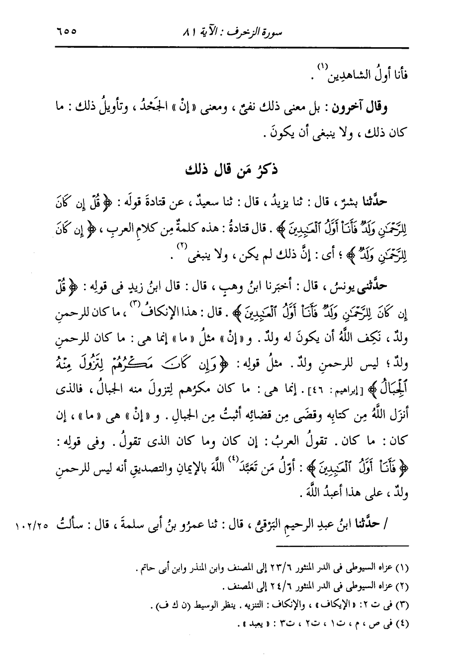 ذِكْرُ مَنْ قَالَ ذَلِكَ: حَدَّثَنَا بِشْرٌ قَالَ: ثَنَا يَزِيدُ قَالَ: ثَنَا سَعِيدٌ، عَنْ قَتَادَةَ، قَوْلَهُ: {قُلْ إِنْ كَانَ لِلرَّحْمَنِ وَلَدٌ فَأَنَا أَوَّلُ الْعَابِدِينَ} [الزخرف: 81] قَالَ قَتَادَةُ: «وَهَذِهِ كَلِمَةٌ مِنْ كَلَامِ الْعَرَبِ» {§إِنْ كَانَ لِلرَّحْمَنِ وَلَدٌ} [الزخرف: 81] «أَيْ إِنَّ ذَلِكَ لَمْ يَكُنْ، وَلَا يَنْبَغِي»