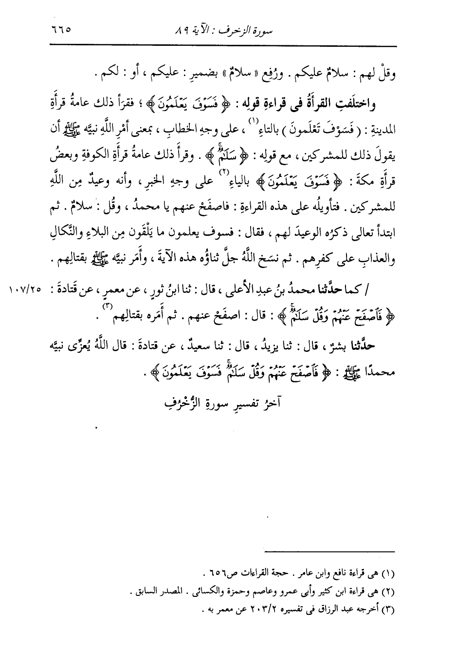 {وَقُلْ} [آل عمران: 20] لَهُمْ {سَلَامٌ} [الأنعام: 54] عَلَيْكُمْ وَرَفَعَ سَلَامٌ بِضَمِيرِ عَلَيْكُمْ أَوْ لَكُمْ وَاخْتَلَفَتِ الْقُرَّاءُ فِي قِرَاءَةِ قَوْلِهِ: {فَسَوْفَ يَعْلَمُونَ} [الحجر: 3] فَقَرَأَ ذَلِكَ عَامَّةُ قُرَّاءِ الْمَدِينَةِ (فَسَوْفَ تَعْلَمُونَ) بِالتَّاءِ عَلَى وَجْهِ الْخَطَّابِ، بِمَعْنَى: أَمَرَ اللَّهُ عَزَّ وَجَلَّ نَبِيَّهُ صَلَّى اللهُ عَلَيْهِ وَسَلَّمَ أَنْ يَقُولَ ذَلِكَ لِلْمُشْرِكِينَ، مَعَ قَوْلِهِ: {سَلَامٌ} [الأنعام: 54] ، وَقَرَأَتْهُ عَامَّةُ قُرَّاءِ الْكُوفَةِ وَبَعْضُ قُرَّاءِ مَكَّةَ {فَسَوْفَ يَعْلَمُونَ} [الحجر: 3] بِالْيَاءِ عَلَى وَجْهِ الْخَبَرِ، وَأَنَّهُ وَعِيدٌ مِنَ اللَّهِ لِلْمُشْرِكِينَ، فَتَأْوِيلُهُ عَلَى هَذِهِ الْقِرَاءَةِ: {فَاصْفَحْ عَنْهُمْ} [الزخرف: 89] يَا مُحَمَّدُ {وَقُلْ سَلَامٌ} [الزخرف: 89] ثُمَّ ابْتَدَأَ تَعَالَى ذِكْرُهُ الْوَعِيدَ لَهُمْ، فَقَالَ {فَسَوْفَ يَعْلَمُونَ} [الحجر: 3] مَا يُلْقُونَ مِنَ الْبَلَاءِ وَالنَّكَالِ وَالْعَذَابِ عَلَى كُفْرِهِمْ، ثُمَّ نَسَخَ اللَّهُ جَلَّ ثَنَاؤُهُ هَذِهِ الْآيَةَ، وَأَمَرَ نَبِيَّهُ صَلَّى اللهُ عَلَيْهِ وَسَلَّمَ بِقِتَالِهِمْ