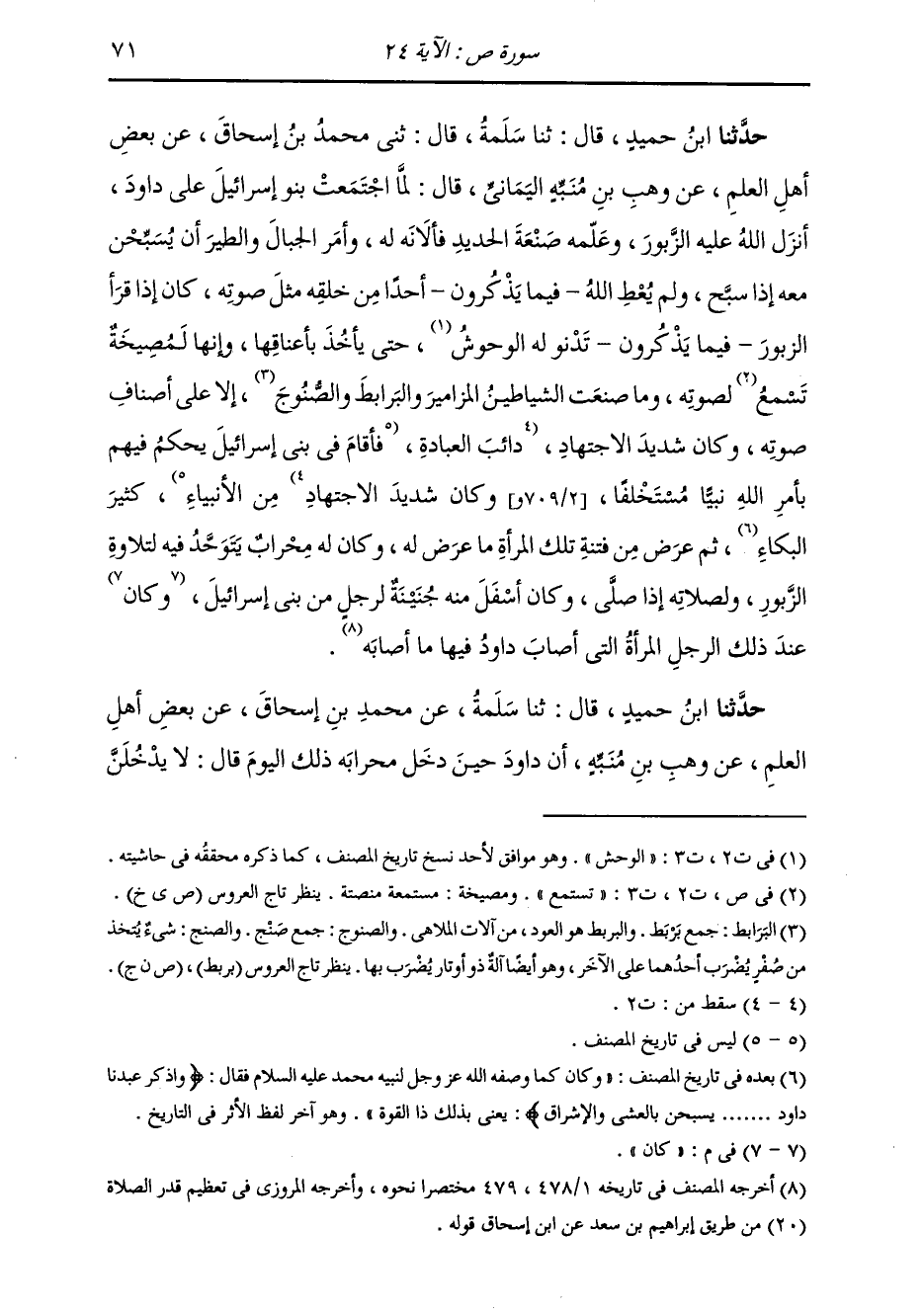 حَدَّثَنَا ابْنُ حُمَيْدٍ، قَالَ: ثنا سَلَمَةُ، قَالَ: ثني مُحَمَّدُ بْنُ إِسْحَاقَ، عَنْ بَعْضِ أَهْلِ الْعِلْمِ، عَنْ وَهْبِ بْنِ مُنَبِّهٍ الْيَمَانِيِّ، قَالَ: «§لَمَّا اجْتَمَعَتْ بَنُو إِسْرَائِيلَ عَلَى دَاوُدَ، أَنْزَلَ اللَّهُ عَلَيْهِ الزَّبُورَ، وَعَلَّمَهُ صَنْعَةَ الْحَدِيدِ، فَأَلَانَهُ لَهُ، وَأَمَرَ الْجِبَالَ وَالطَّيْرَ أَنْ يُسَبِّحْنَ مَعَهُ إِذَا سَبَّحَ، وَلَمْ يُعْطِ اللَّهُ فِيمَا يَذْكُرُونَ أَحَدًا مِنْ خَلْقِهِ مِثْلَ صَوْتِهِ، كَانَ إِذَا قَرَأَ الزَّبُورَ فِيمَا يَذْكُرُونَ تَدْنُو لَهُ الْوحُوشُ حَتَّى يَأْخُذَ بِأَعْنَاقِهَا، وَإِنَّهَا لَمُصِيخَةٌ تَسْمَعُ لِصَوْتِهِ، وَمَا صَنَعَتِ الشَّيَاطِينُ الْمَزَامِيرَ وَالْبَرَابِطَ وَالصُّنُوجَ، إِلَّا عَلَى أَصْنَافِ صَوْتِهِ، وَكَانَ شَدِيدَ الِاجْتِهَادِ دَائِبَ الْعِبَادَةِ، فَأَقَامَ فِي بَنِي إِسْرَائِيلَ يَحْكُمُ فِيهِمْ بِأَمْرِ اللَّهِ نَبِيًّا مُسْتَخْلِفًا، وَكَانَ شَدِيدَ الِاجْتِهَادِ مِنَ الْأَنْبِيَاءِ، كَثِيرَ الْبُكَاءِ، ثُمَّ عَرَضَ مِنْ فِتْنَةِ تِلْكَ الْمَرْأَةِ مَا عَرَضَ لَهُ، وَكَانَ لَهُ مِحْرَابٌ يَتَوَحَّدُ فِيهِ لِتِلَاوَةِ الزَّبُورِ، وَلِصَلَاتِهِ إِذَا صَلَّى، وَكَانَ أَسْفَلَ مِنْهُ جُنَيْنَةٌ لِرَجُلٍ مِنْ بَنِي إِسْرَائِيلَ، كَانَ عِنْدَ ذَلِكَ الرَّجُلِ الْمَرْأَةٌ الَّتِي أَصَابَ دَاوُدُ فِيهَا مَا أَصَابَهُ»
