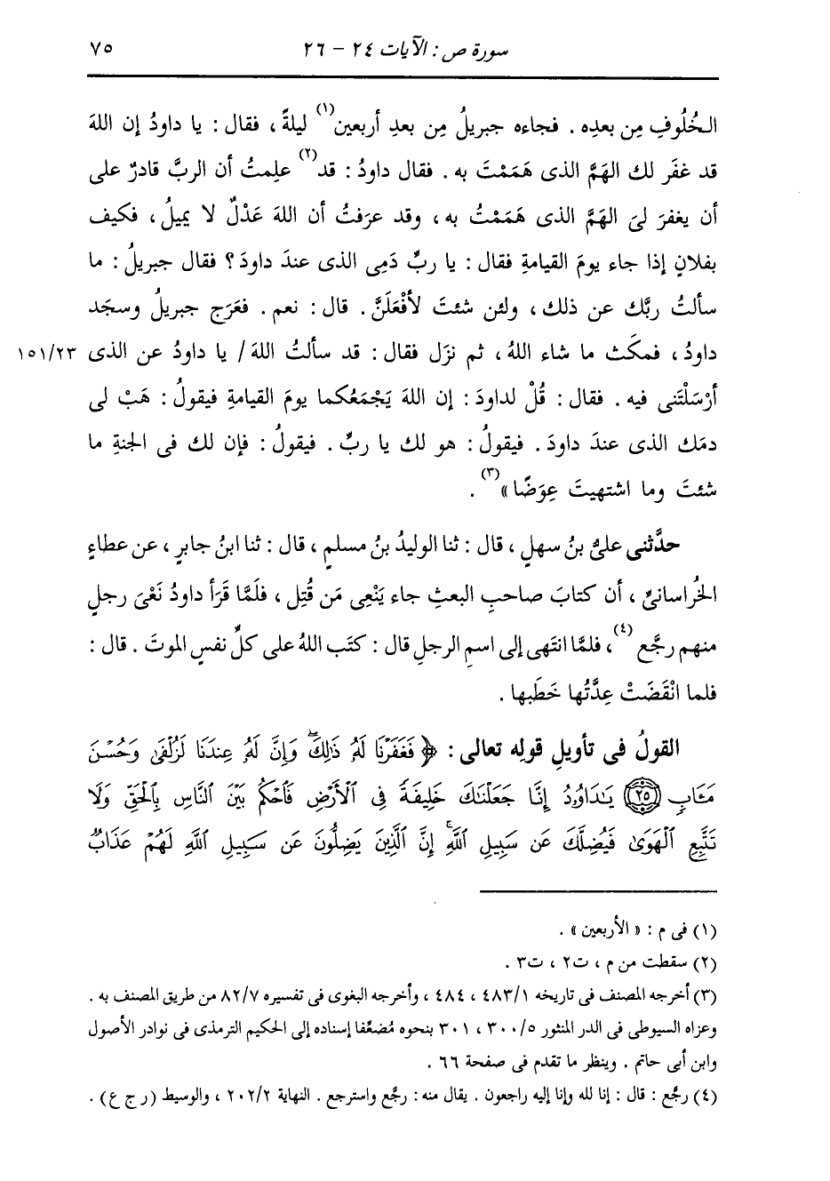 §الْقَوْلُ فِي تَأْوِيلِ قَوْلِهِ تَعَالَى: {فَغَفَرْنَا لَهُ ذَلِكَ وَإِنَّ لَهُ عِنْدَنَا لَزُلْفَى وَحُسْنَ مَآبٍ يَا دَاوُدُ إِنَّا جَعَلْنَاكَ خَلِيفَةً فِي الْأَرْضِ فَاحْكُمْ بَيْنَ النَّاسِ بِالْحَقِّ وَلَا تَتَّبِعِ الْهَوَى فَيُضِلَّكَ عَنْ سَبِيلِ اللَّهِ إِنَّ الَّذِينَ يَضِلُّونَ عَنْ سَبِيلِ اللَّهِ لَهُمْ عَذَابٌ -[76]- شَدِيدٌ بِمَا نَسُوا يَوْمَ الْحِسَابِ} يَعْنِي تَعَالَى ذِكْرُهُ بِقَوْلِهِ: {فَغَفَرْنَا لَهُ ذَلِكَ} [ص: 25] فَعَفَوْنَا عَنْهُ، وَصفَحْنَا لَهُ عَنْ أَنْ نُؤَاخِذَهُ بِخَطِيئَتِهِ وَذَنْبِهِ ذَلِكَ {وَإِنَّ لَهُ عِنْدَنَا لَزُلْفَى} [ص: 25] يَقُولُ: وَإِنَّ لَهُ عِنْدَنَا لَلْقُرْبَةَ مِنَّا يَوْمَ الْقِيَامَةِ وَبِنَحْوِ الَّذِي قُلْنَا فِي قَوْلِهِ: {فَغَفَرْنَا لَهُ ذَلِكَ} [ص: 25] قَالَ أَهْلُ التَّأْوِيلِ