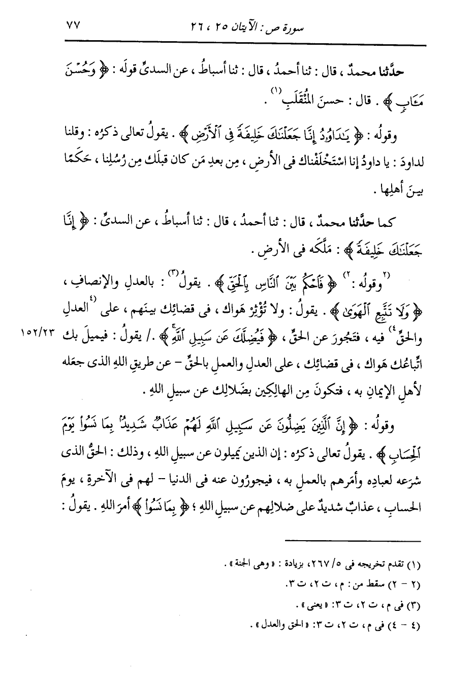 §وَقَوْلُهُ {فَاحْكُمْ بَيْنَ النَّاسِ بِالْحَقِّ} [ص: 26] يَعْنِي: بِالْعَدْلِ وَالْإِنْصَافِ {وَلَا تَتْبَعِ الْهَوَى} [ص: 26] يَقُولُ: وَلَا تُؤْثِرْ هَوَاكَ فِي قَضَائِكَ بَيْنَهُمْ عَلَى الْحَقِّ وَالْعَدْلِ فِيهِ، فَتَجُورُ عَنِ الْحَقِّ {فَيُضِلَّكَ عَنْ سَبِيلِ اللَّهِ} [ص: 26] يَقُولُ: فَيَمِيلَ بِكَ اتِّبَاعُكَ هَوَاكَ فِي قَضَائِكَ عَلَى الْعَدْلِ وَالْعَمَلِ بِالْحَقِّ عَنْ طَرِيقِ اللَّهِ الَّذِي جَعَلَهُ لِأَهْلِ الْإِيمَانِ فِيهِ، فَتَكُونَ مِنَ الْهَالِكِينَ بِضَلَالِكَ عَنْ سَبِيلِ اللَّهِ