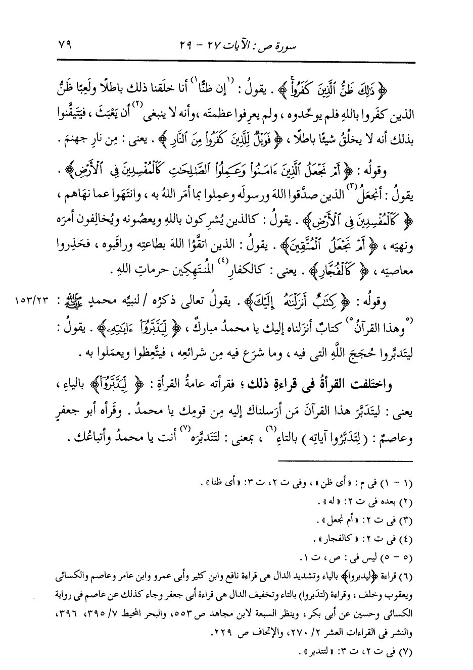 §وَقَوْلُهُ: {كِتَابٌ أَنْزَلْنَاهُ إِلَيْكَ} [إبراهيم: 1] يَقُولُ تَعَالَى ذِكْرُهُ لِنَبِيِّهِ مُحَمَّدٍ صَلَّى اللهُ عَلَيْهِ وَسَلَّمَ: وَهَذَا الْقُرْآنُ {كِتَابٌ أَنْزَلْنَاهُ إِلَيْكَ} [إبراهيم: 1] يَا مُحَمَّدُ {مُبَارَكٌ لِيَدَّبَّرُوا آيَاتِهِ} [ص: 29] يَقُولُ: لَيَتَدَبَّرُوا حُجَجِ اللَّهِ الَّتِي فِيهِ، وَمَا شَرَعَ فِيهِ مِنْ شَرَائِعِهِ، فَيَتَّعِظُوا وَيَعْمَلُوا بِهِ وَاخْتَلَفَتِ الْقُرَّاءُ فِي قِرَاءَةِ ذَلِكَ، فَقَرَأَتْهُ عَامَّةُ الْقُرَّاءِ: {لِيَدَّبَّرُوا} [ص: 29] بِالْيَاءِ، يَعْنِي: لِيَتَدَبَّرَ هَذَا الْقُرْآنَ مَنْ أَرْسَلْنَاكَ إِلَيْهِ مِنْ قَوْمِكِ يَا مُحَمَّدُ وَقَرَاءَهُ أَبُو جَعْفَرٍ وَعَاصِمٌ (لَتَدَّبَّرُوا آيَاتِهِ) بِالتَّاءِ، بِمَعْنَى: لِتَتَدَبَّرَهُ أَنْتَ يَا مُحَمَّدُ وَأَتْبَاعُكَ