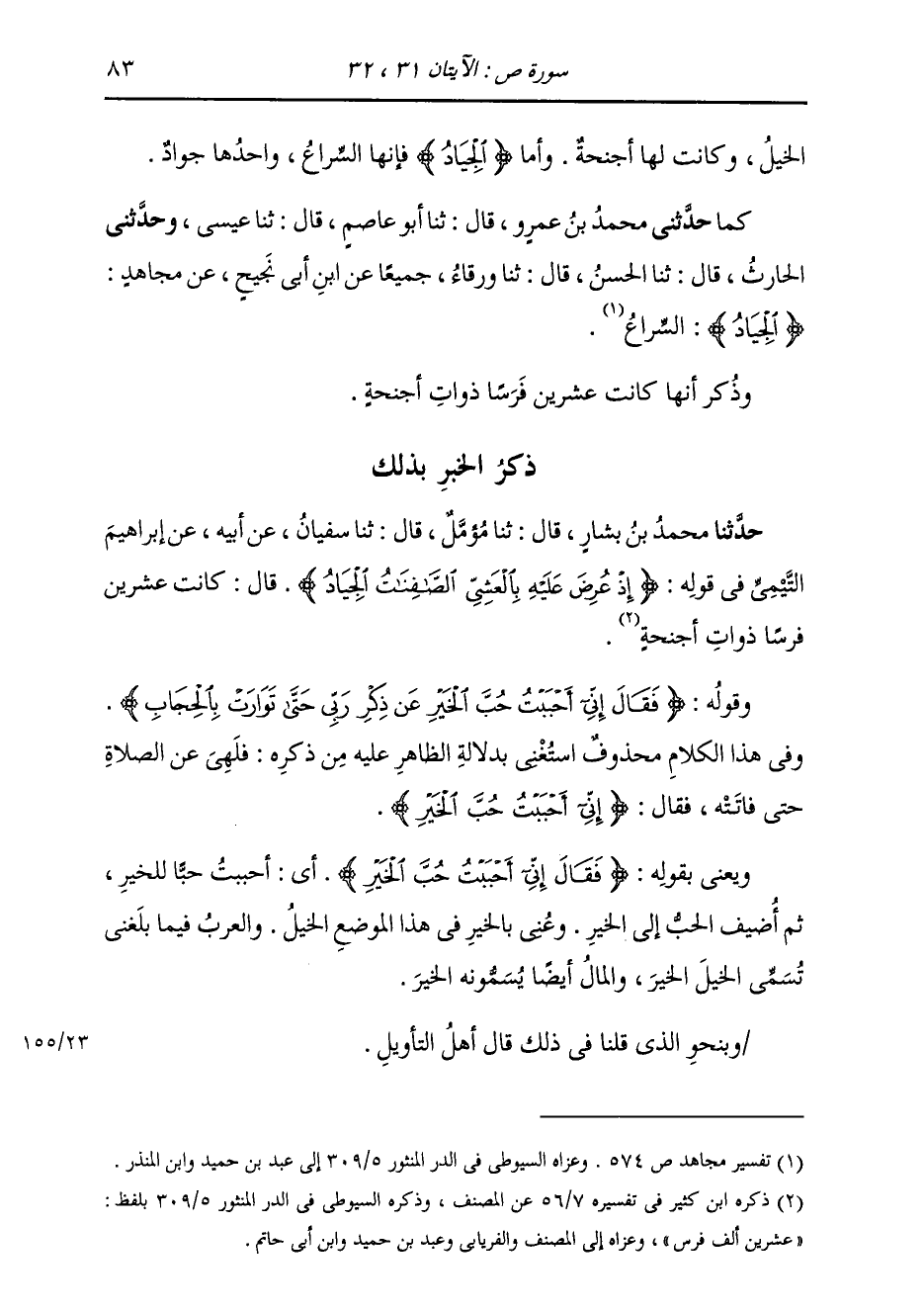 كَمَا: حَدَّثَنِي مُحَمَّدُ بْنُ عَمْرٍو، قَالَ: ثنا أَبُو عَاصِمٍ، قَالَ: ثنا عِيسَى، وَحَدَّثَنِي الْحَارِثُ، قَالَ ثنا الْحَسَنُ، قَالَ: ثنا وَرْقَاءُ، جَمِيعًا عَنِ ابْنِ أَبِي نَجِيحٍ، عَنْ مُجَاهِدٍ {§الْجِيَادُ} [ص: 31] : قَالَ: «السِّرَاعُ» وَذُكِرَ أَنَّهَا كَانَتْ عِشْرِينَ فَرَسًا ذَوَاتَ أَجْنِحَةٍ