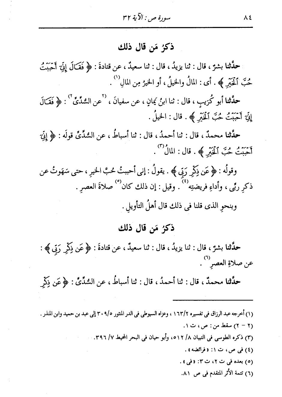 حَدَّثَنَا مُحَمَّدٌ، قَالَ: ثنا أَحْمَدُ، قَالَ: ثنا أَسْبَاطٌ، عَنِ السُّدِّيِّ، {عَنْ ذِكْرِ -[85]- رَبِّي} [ص: 32] قَالَ: «§صَلَاةِ الْعَصْرِ»