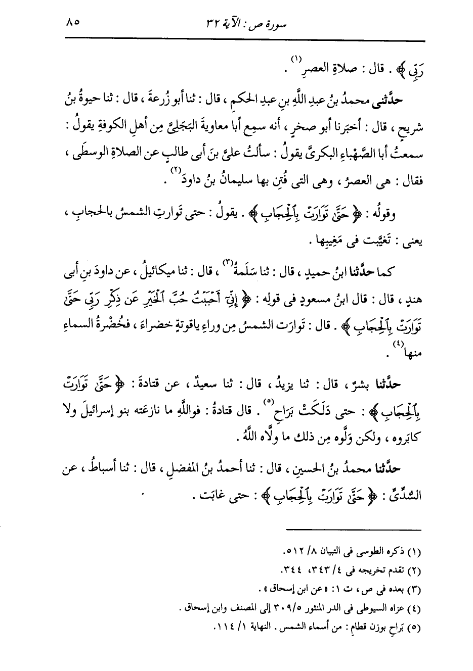 حَدَّثَنَا مُحَمَّدُ بْنُ الْحُسَيْنِ، قَالَ: ثنا أَحْمَدُ بْنُ الْمُفَضَّلِ، قَالَ: ثنا أَسْبَاطٌ، عَنِ السُّدِّيِّ، {§حَتَّى تَوَارَتْ بِالْحِجَابِ} [ص: 32] «حَتَّى غَابَتْ»