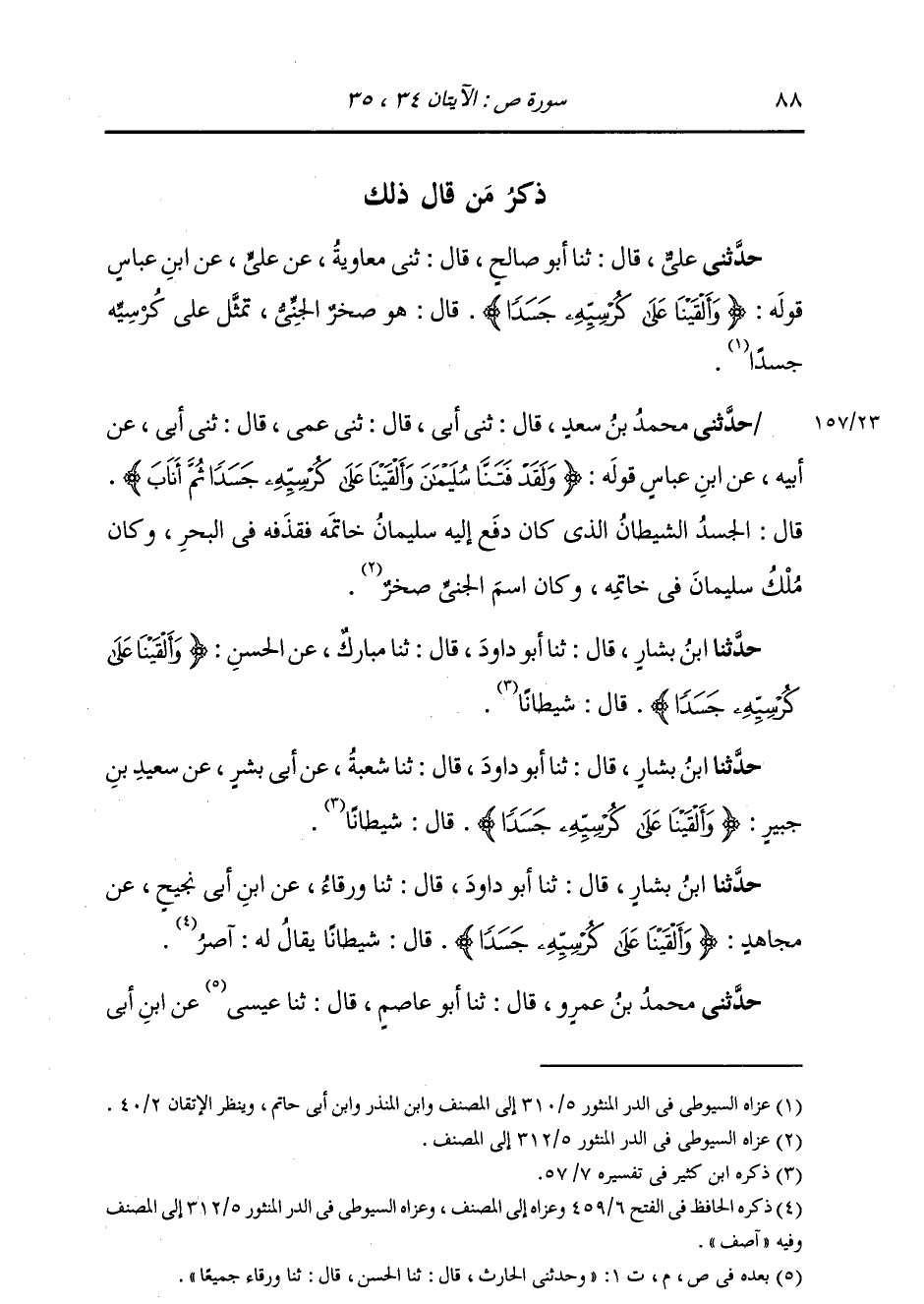 ذِكْرُ مَنْ قَالَ ذَلِكَ: حَدَّثَنِي عَلِيٌّ، قَالَ: ثنا أَبُو صَالِحٍ، قَالَ: ثني مُعَاوِيَةُ، عَنْ عَلِيٍّ، عَنِ ابْنِ عَبَّاسٍ، قَوْلُهُ: {§وَأَلْقَيْنَا عَلَى كُرْسِيِّهِ جَسَدًا} [ص: 34] قَالَ: «هُوَ صَخْرٌ الْجِنِّيُّ تَمَثَّلَ عَلَى كُرْسِيِّهِ جَسَدًا»