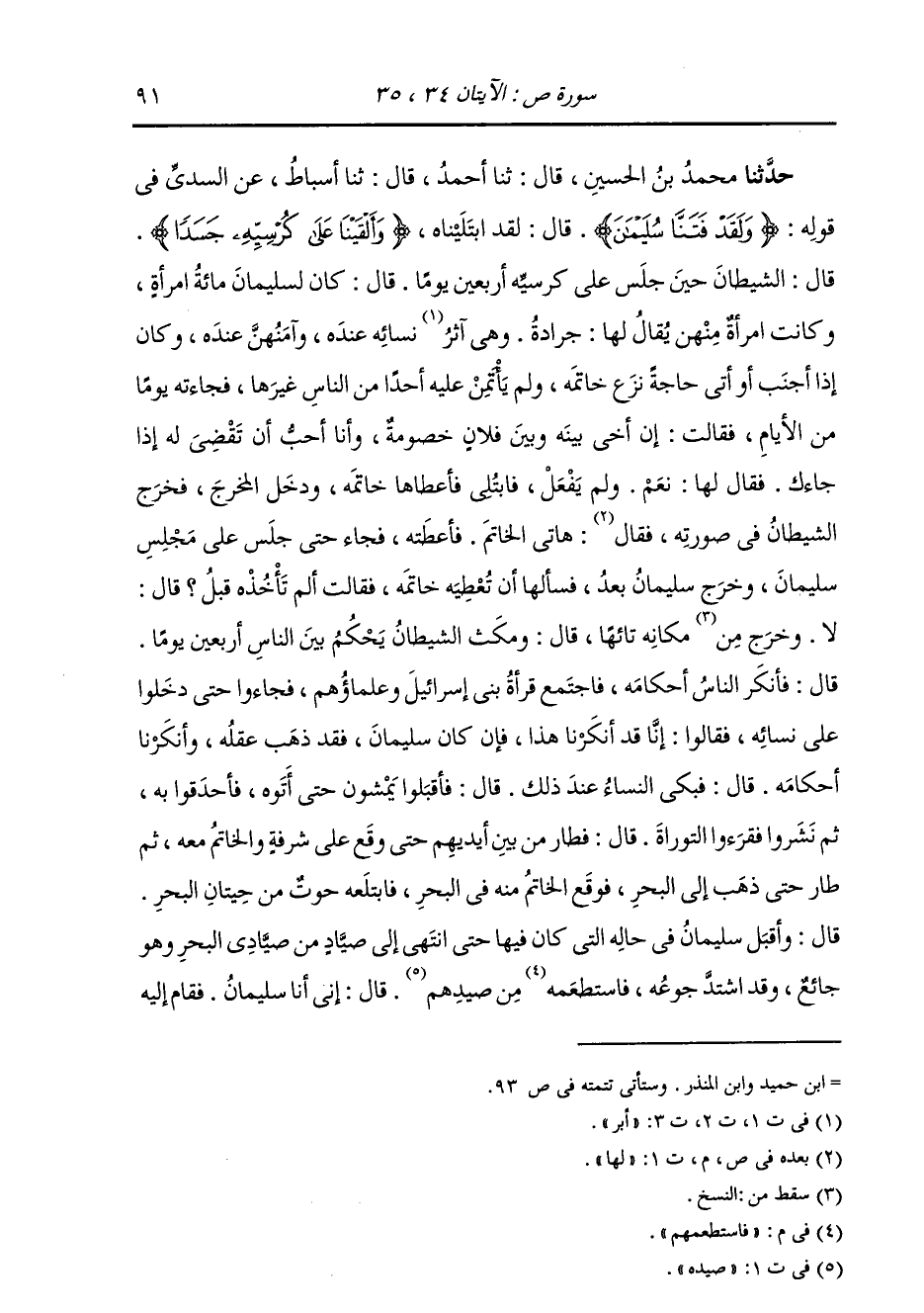 حَدَّثَنَا مُحَمَّدُ بْنُ الْحُسَيْنِ، قَالَ: ثنا أَحْمَدُ، قَالَ: ثنا أَسْبَاطٌ، عَنِ السُّدِّيِّ، فِي قَوْلِهِ: {وَلَقَدْ فَتَنَّا سُلَيْمَانَ} [ص: 34] قَالَ: " §لَقَدِ ابْتَلَيْنَا {وَأَلْقَيْنَا عَلَى كُرْسِيِّهِ جَسَدًا} [ص: 34] قَالَ: الشَّيْطَانُ حِينَ جَلَسَ عَلَى كُرْسِيِّهِ أَرْبَعِينَ يَوْمًا؛ قَالَ: كَانَ لِسُلَيْمَانَ مِائَةُ امْرَأَةٍ، وَكَانَتِ امْرَأَةٌ مِنْهُنَّ يُقَالُ لَهَا جَرَادَةٌ، وَهِيَ آثَرُ نِسَائِهِ عِنْدَهُ، وَآمَنُهُنَّ عِنْدَهُ، وَكَانَ إِذَا أَجْنَبَ أَوِ أَتَى حَاجَةً نَزَعَ خَاتَمَهُ، وَلَمْ يَأْتَمِنْ عَلَيْهِ أَحَدًا مِنَ النَّاسِ غَيْرَهَا؛ فَجَاءَتْهُ يَوْمًا مِنَ الْأَيَّامِ، فَقَالَتْ: إِنَّ أَخِي بَيْنَهُ وَبَيْنَ فُلَانٍ خُصُومَةٌ، وَأَنَا أَحِبُّ أَنْ تَقْضِيَ لَهُ إِذَا جَاءَكَ، فَقَالَ لَهَا: نَعَمْ، وَلَمْ يَفْعَلْ، فَابْتُلِيَ وَأَعْطَاهَا خَاتَمَهُ، وَدَخَلَ الْمَخْرَجَ، فَخَرَجَ الشَّيْطَانُ فِي صُورَتِهِ، فَقَالَ لَهَا: هَاتِي الْخَاتَمَ، فَأَعْطَتْهُ، فَجَاءَ حَتَّى جَلَسَ عَلَى مَجْلِسِ سُلَيْمَانَ، وَخَرَجَ سُلَيْمَانُ بَعْدُ، فَسَأَلَهَا أَنْ تُعْطِيَهُ خَاتَمَهُ، فَقَالَتْ: أَلَمْ تَأْخُذْهُ قَبْلُ؟ قَالَ: لَا، وَخَرَجَ مَكَانَهُ تَائِهًا؛ قَالَ: وَمَكَثَ الشَّيْطَانُ يَحْكُمُ بَيْنَ النَّاسِ أَرْبَعِينَ يَوْمًا قَالَ: فَأَنْكَرَ النَّاسُ أَحْكَامَهُ، فَاجْتَمَعَ قُرَّاءُ بَنِي إِسْرَائِيلَ وَعُلَمَاؤُهُمْ، فَجَاءُوا حَتَّى دَخَلُوا عَلَى نِسَائِهِ، فَقَالُوا: إِنَّا قَدْ أَنْكَرْنَا هَذَا فَإِنْ كَانَ سُلَيْمَانُ فَقَدْ ذَهَبَ عَقْلُهُ وَأَنْكَرْنَا أَحْكَامَهُ قَالَ: فَبَكَى النِّسَاءُ عِنْدَ ذَلِكَ، قَالَ: فَأَقْبَلُوا يَمْشُونَ حَتَّى أَتَوْهُ، فَأَحْدَقُوا بِهِ، ثُمَّ نَشَرُوا التَّوْرَاةَ، فَقَرَءُوا؛ قَالَ: فَطَارَ مِنْ بَيْنِ أَيْدِيهِمْ حَتَّى وَقَعَ عَلَى شُرْفَةٍ وَالْخَاتَمُ مَعَهُ، ثُمَّ طَارَ حَتَّى ذَهَبَ إِلَى الْبَحْرِ، فَوَقَعَ الْخَاتَمُ مِنْهُ فِي الْبَحْرِ، فَابْتَلَعَهُ حُوتٌ مِنْ حَيَّتَانِ الْبَحْرِ قَالَ: وَأَقْبَلَ سُلَيْمَانُ فِي حَالِهِ الَّتِي كَانَ فِيهَا حَتَّى انْتَهَى إِلَى صَيَّادٍ مِنْ صَيَّادِي الْبَحْرِ وَهُوَ جَائِعٌ، وَقَدِ اشْتَدَّ جُوعُهُ، فَاسْتَطْعَمَهُمْ مِنْ صَيْدِهِمْ، قَالَ: إِنِّي أَنَا سُلَيْمَانُ، فَقَامَ إِلَيْهِ