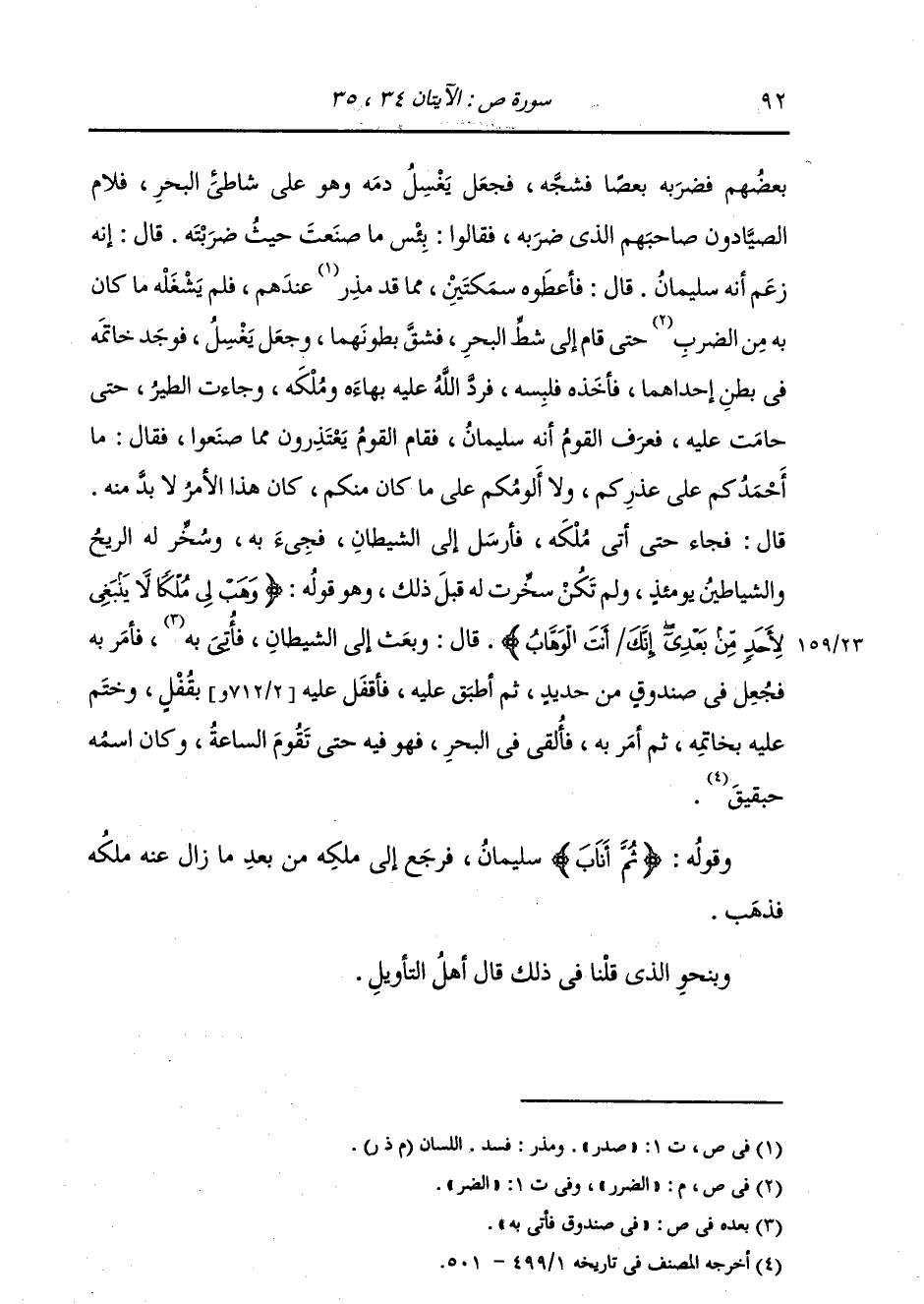§وَقَوْلُهُ: {ثُمَّ أَنَابَ} [ص: 34] سُلَيْمَانُ، فَرَجَعَ إِلَى مُلْكِهِ مِنْ بَعْدِ مَا زَالَ عَنْهُ مُلْكُهُ فَذَهَبَ وَبِنَحْوِ الَّذِي قُلْنَا فِي ذَلِكَ قَالَ أَهْلُ التَّأْوِيلِ