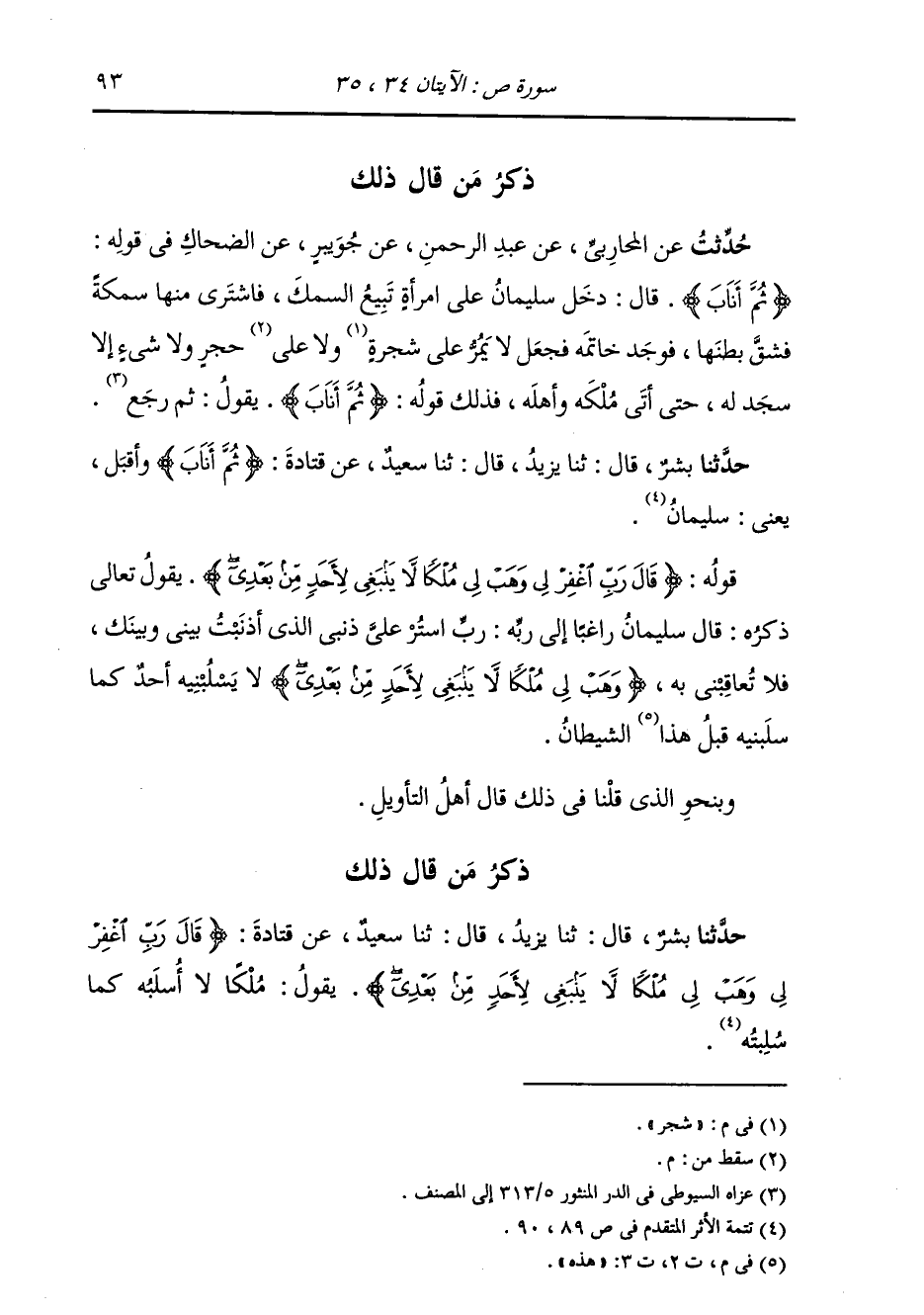 ذِكْرُ مَنْ قَالَ ذَلِكَ: حَدَّثَنَا بِشْرٌ، قَالَ: ثنا يَزِيدُ، قَالَ: ثنا سَعِيدٌ، عَنْ قَتَادَةَ، {§قَالَ رَبِّ اغْفِرْ لِي وَهَبْ لِي مُلْكًا لَا يَنْبَغِي لِأَحَدٍ مِنْ بَعْدِي} [ص: 35] يَقُولُ: «مُلْكًا لَا أُسْلَبُهُ كَمَا سُلِبْتُهُ» -[94]- وَكَانَ بَعْضُ أَهْلِ الْعَرَبِيَّةِ يُوَجِّهُ مَعْنَى قَوْلِهِ: {لَا يَنْبَغِي لِأَحَدٍ مِنْ بَعْدِي} [ص: 35] إِلَى: أَنْ لَا يَكُونَ لِأَحَدٍ مِنْ بَعْدِي، كَمَا قَالَ ابْنُ أَحْمَرَ:
