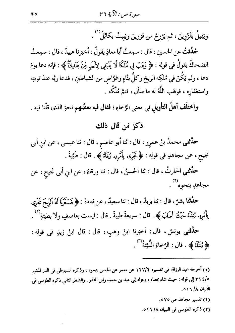 حُدِّثْتُ عَنِ الْحُسَيْنِ، قَالَ: سَمِعْتُ أَبَا مُعَاذٍ، يَقُولُ: أَخْبَرَنَا عُبَيْدٌ، قَالَ: سَمِعْتُ الضَّحَّاكَ، يَقُولُ فِي قَوْلِهِ: {§وَهَبْ لِي مُلْكًا لَا يَنْبَغِي لِأَحَدٍ مِنْ بَعْدِي} [ص: 35] «فَإِنَّهُ دَعَا يَوْمَ دَعَا وَلَمْ يَكُنْ فِي مُلْكِهِ الرِّيحُ، وَكُلُّ بَنَّاءٍ وَغَوَّاصٍ مِنَ الشَّيَاطِينِ، فَدَعَا رَبَّهُ عِنْدَ تَوْبَتِهِ وَاسْتِغْفَارِهِ، فَوَهَبَ اللَّهُ لَهُ مَا سَأَلَ، فَتَمَّ مُلْكَهُ» وَاخْتَلَفَ أَهْلُ التَّأْوِيلِ فِي مَعْنَى الرَّخَاءِ، فَقَالَ فِيهِ بَعْضُهُمْ نَحْوَ الَّذِي قُلْنَا فِيهِ