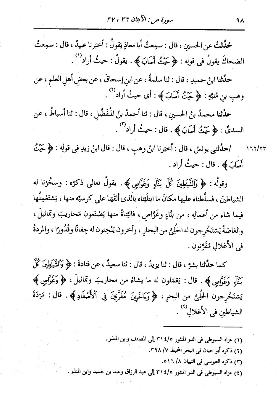كَمَا: حَدَّثَنَا بِشْرٌ، قَالَ: ثنا يَزِيدُ، قَالَ: ثنا سَعِيدٌ، عَنْ قَتَادَةَ، {§وَالشَّيَاطِينُ كُلَّ بَنَّاءٍ وَغَوَّاصٍ} [ص: 37] قَالَ: «يَعْمَلُونَ لَهُ مَا يَشَاءُ مِنْ مَحَارِيبَ وَتَمَاثيلَ، وَغَوَّاصٍ يَسْتَخْرِجُونَ الْحُلِيَّ مِنَ الْبَحْرِ» {وَآخَرِينَ مُقَرَّنِينَ فِي الْأَصْفَادِ} [ص: 38] قَالَ: «مَرَدَةُ الشَّيَاطِينِ فِي الْأَغْلَالِ»