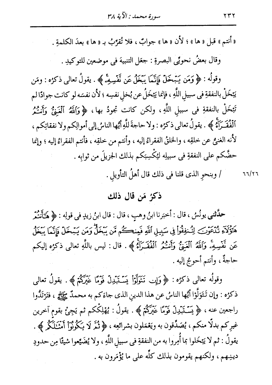 ذِكْرُ مَنْ قَالَ ذَلِكَ: حَدَّثَنِي يُونُسُ، قَالَ: أَخْبَرَنَا ابْنُ وَهْبٍ، قَالَ: قَالَ ابْنُ زَيْدٍ، فِي قَوْلِهِ: {§هَا أَنْتُمْ هَؤُلَاءِ تُدْعَوْنَ لِتُنْفِقُوا فِي سَبِيلِ اللَّهِ فَمِنْكُمْ مَنْ يَبْخَلُ وَمَنْ يَبْخَلْ فَإِنَّمَا يَبْخَلُ عَنْ نَفْسِهِ وَاللَّهُ الْغَنِيُّ وَأَنْتُمُ الْفُقَرَاءُ} قَالَ: «لَيْسَ بِاللَّهِ تَعَالَى ذِكْرُهُ إِلَيْكُمْ حَاجَةٌ وَأَنْتُمْ أَحْوَجُ إِلَيْهِ»