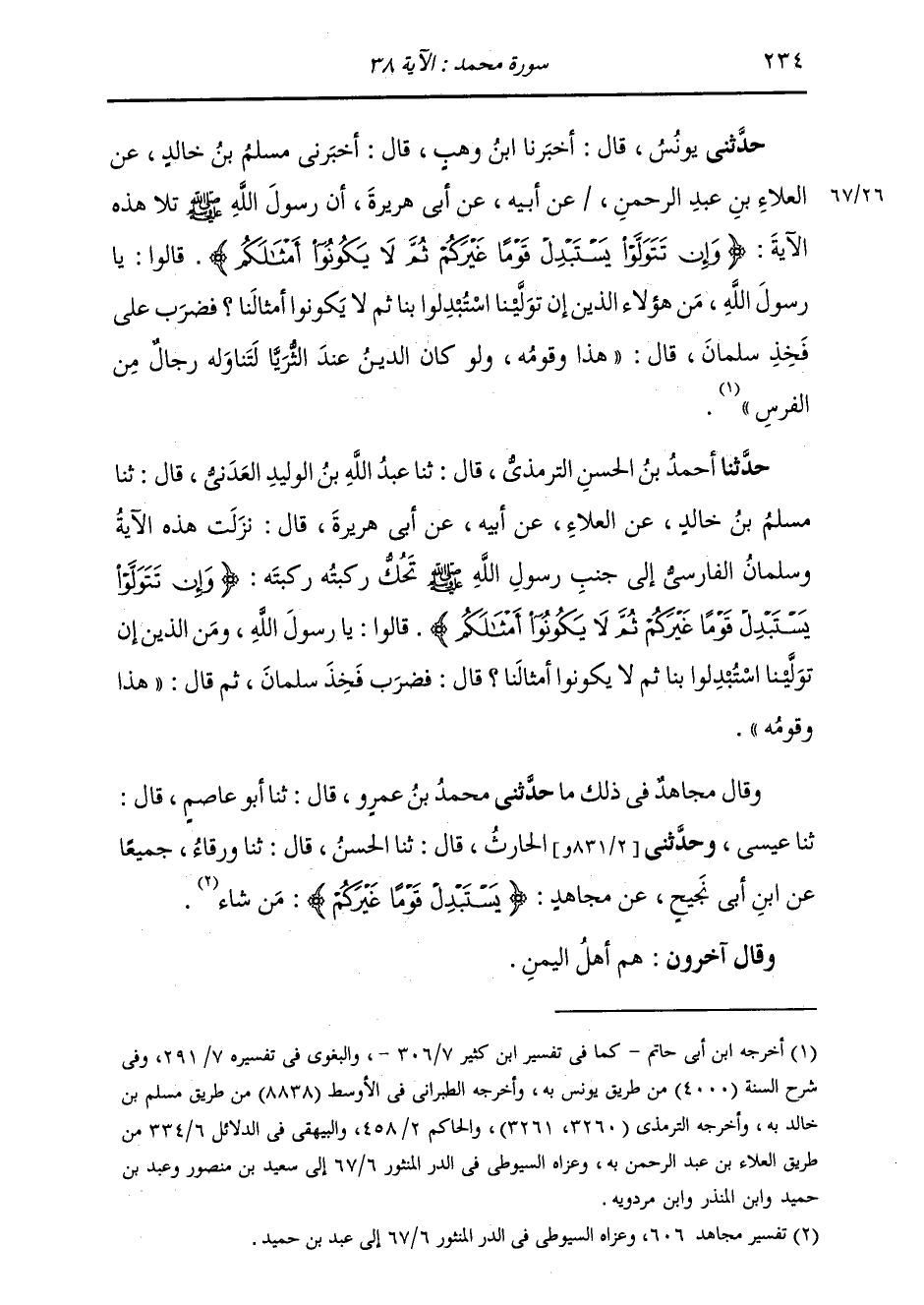 حَدَّثَنِي يُونُسُ، قَالَ: أَخْبَرَنَا ابْنُ وَهْبٍ، قَالَ: أَخْبَرَنِي مُسْلِمُ بْنُ خَالِدٍ، عَنِ الْعَلَاءِ بْنِ عَبْدِ الرَّحْمَنِ، عَنْ أَبِيهِ، عَنْ أَبِي هُرَيْرَةَ أَنَّ رَسُولَ اللَّهِ صَلَّى اللهُ عَلَيْهِ وَسَلَّمَ تَلَا هَذِهِ الْآيَةَ {وَإِنْ تَتَوَلَّوْا يَسْتَبْدِلْ قَوْمًا غَيْرَكُمْ ثُمَّ لَا يَكُونُوا أَمْثَالَكُمْ} [محمد: 38] قَالُوا: يَا رَسُولَ اللَّهِ مَنْ هَؤُلَاءِ الَّذِينَ إِنْ تَوَلَّيْنَا اسْتُبْدِلُوا بِنَا، ثُمَّ لَا يَكُونُوا أَمْثَالَنَا؟ فَضَرَبَ عَلَى فَخِذِ سَلْمَانَ قَالَ: «هَذَا وَقَوْمُهُ، §وَلَوْ كَانَ الدِّينُ عِنْدَ الثُّرَيَّا لَتَنَاوَلَهُ رِجَالٌ مِنَ الْفُرْسِ»
