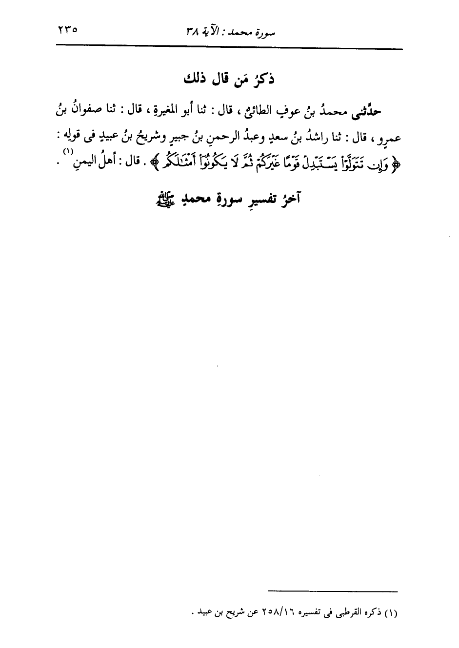 ذِكْرُ مَنْ قَالَ ذَلِكَ: حَدَّثَنِي مُحَمَّدُ بْنُ عَوْفٍ الطَّائِيُّ، قَالَ: ثَنَا أَبُو الْمُغِيرَةِ، قَالَ: ثَنَا صَفْوَانُ بْنُ عَمْرٍو، قَالَ: ثَنَا رَاشِدُ بْنُ سَعْدٍ، وَعَبْدُ الرَّحْمَنِ بْنُ جُبَيْرٍ، وَشُرَيْحُ بْنُ عُبَيْدٍ، فِي قَوْلِهِ: {§وَإِنْ تَتَوَلَّوْا يَسْتَبْدِلْ قَوْمًا غَيْرَكُمْ ثُمَّ لَا يَكُونُوا أَمْثَالَكُمْ} [محمد: 38] قَالَ: «أَهْلُ الْيَمَنِ»