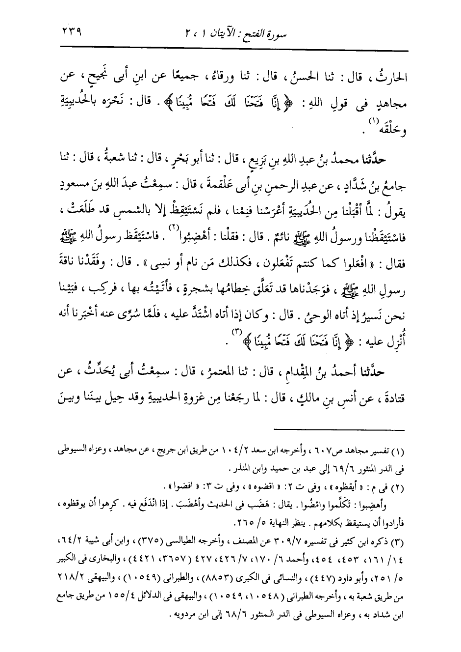 حَدَّثَنَا مُحَمَّدُ بْنُ عَبْدِ اللَّهِ بْنِ بَزِيعٍ، قَالَ: ثَنَا أَبُو بَحْرٍ، قَالَ: ثَنَا شُعْبَةُ، قَالَ: ثَنَا جَامِعُ بْنُ شَدَّادٍ، عَنْ عَبْدِ الرَّحْمَنِ بْنِ أَبِي عَلْقَمَةَ، قَالَ: سَمِعْتُ عَبْدَ اللَّهِ بْنَ مَسْعُودٍ، يَقُولُ: لَمَّا أَقْبَلْنَا مِنَ الْحُدَيْبِيَةِ أَعْرَسْنَا فَنِمْنَا، فَلَمْ نَسْتَيْقِظْ إِلَّا بِالشَّمْسِ قَدْ طَلَعَتْ، فَاسْتَيْقَظْنَا وَرَسُولُ اللَّهِ صَلَّى اللهُ عَلَيْهِ وَسَلَّمَ نَائِمٌ، قَالَ: فَقُلْنَا أَيْقِظُوهُ، فَاسْتَيْقَظَ رَسُولُ اللَّهِ صَلَّى اللهُ عَلَيْهِ وَسَلَّمَ فَقَالَ: «§افْعَلُوا كَمَا كُنْتُمْ تَفْعَلُونَ، فَكَذَلِكَ مَنْ نَامَ أَوْ نَسِيَ» قَالَ: وَفَقَدْنَا نَاقَةَ رَسُولِ اللَّهِ صَلَّى اللهُ عَلَيْهِ وَسَلَّمَ، فَوَجَدْنَاهَا قَدْ تَعَلَّقَ خِطَامُهَا بِشَجَرَةٍ، فَأَتَيْتُهُ بِهَا، فَرَكِبَ فَبَيْنَا نَحْنُ نَسِيرُ، إِذْ أَتَاهُ الْوَحْي، قَالَ: وَكَانَ إِذَا أَتَاهُ اشْتَدَّ عَلَيْهِ؛ فَلَمَّا سُرِّيَ عَنْهُ أَخْبَرَنَا أَنَّهُ أُنْزِلَ عَلَيْهِ: {إِنَّا فَتَحْنَا لَكَ فَتْحًا مُبِينًا} [الفتح: 1]