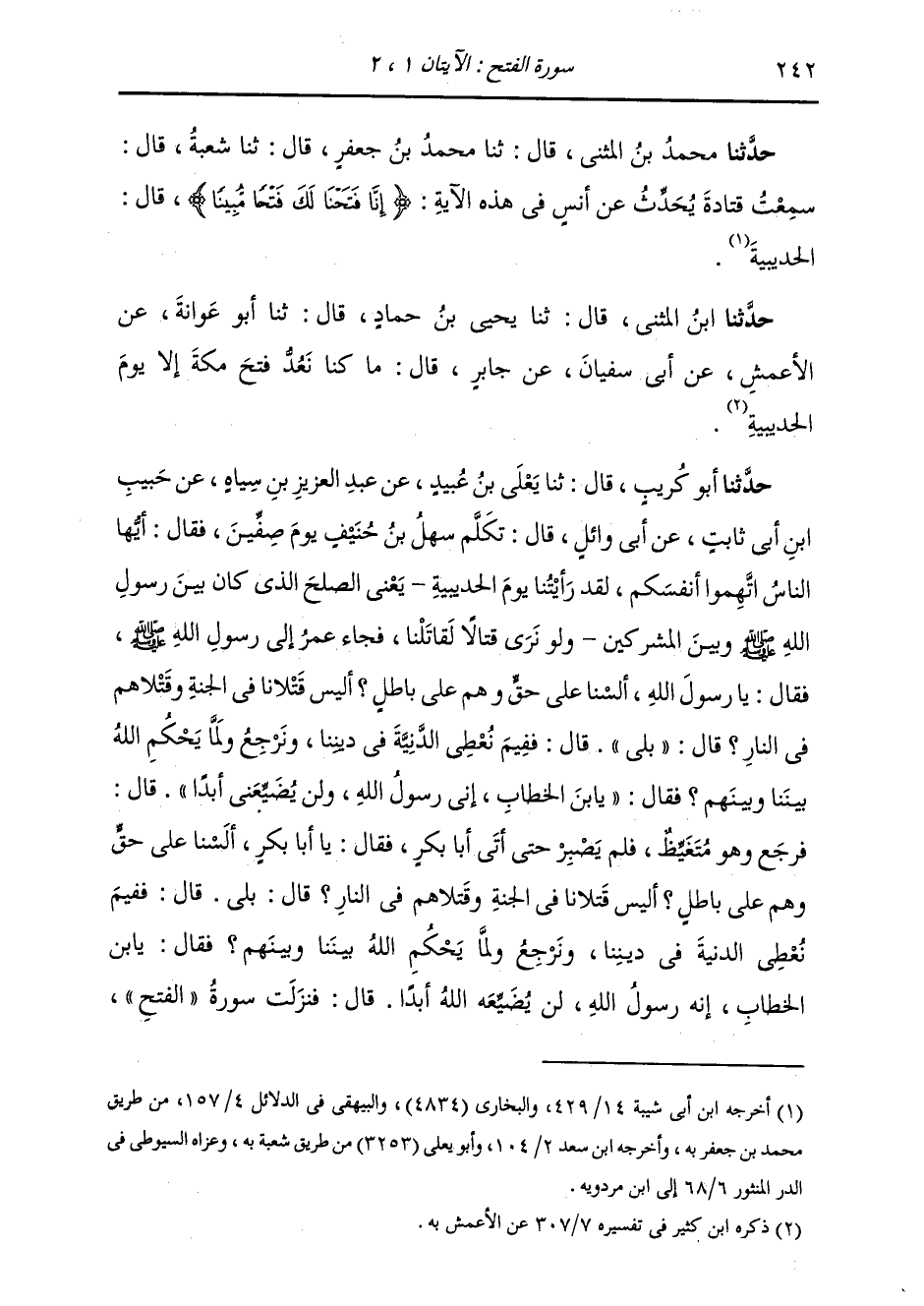 حَدَّثَنَا أَبُو كُرَيْبٍ، قَالَ: ثَنَا يَعْلَى بْنُ عُبَيْدٍ، عَنْ عَبْدِ الْعَزِيزِ بْنِ سِيَاهٍ، عَنْ حَبِيبِ بْنِ أَبِي ثَابِتٍ، عَنْ أَبِي وَائِلٍ، قَالَ: تَكَلَّمَ سَهْلُ بْنُ حُنَيْفٍ يَوْمَ صِفِّينَ، فَقَالَ: يَا أَيُّهَا النَّاسُ اتَّهِمُوا أَنْفُسَكُمْ، لَقَدْ رَأَيْتُنَا يَوْمَ الْحُدَيْبِيَةِ، يَعْنِي الصُّلْحَ الَّذِي كَانَ بَيْنَ رَسُولِ اللَّهِ صَلَّى اللهُ عَلَيْهِ وَسَلَّمَ وَبَيْنَ الْمُشْرِكِينَ، وَلَوْ نَرَى قِتَالًا لَقَاتَلْنَا، فَجَاءَ عُمَرُ إِلَى رَسُولِ اللَّهِ صَلَّى اللهُ عَلَيْهِ وَسَلَّمَ، فَقَالَ: يَا رَسُولَ اللَّهِ، أَلَسْنَا عَلَى حَقٍّ وَهُمْ عَلَى بَاطِلٍ؟ أَلَيْسَ قَتْلَانَا فِي الْجَنَّةِ وَقَتْلَاهُمْ فِي النَّارِ؟ قَالَ: «بَلَى» ، قَالَ: فَفِيمَ نُعْطِي الدَّنِيَّةَ فِي دِينِنَا، وَنَرْجِعُ وَلَمَّا يَحْكُمِ اللَّهُ بَيْنَنَا وَبَيْنَهُمْ؟ فَقَالَ: «يَا ابْنَ الْخَطَّابِ، §إِنِّي رَسُولُ اللَّهِ، وَلَنْ يُضَيِّعَنِي أَبَدًا» ، قَالَ: فَرَجَعَ وَهُوَ مُتَغَيِّظٌ، فَلَمْ يَصْبِرْ حَتَّى أَتَى أَبَا بَكْرٍ، فَقَالَ: يَا أَبَا بَكْرٍ أَلَسْنَا عَلَى حَقٍّ وَهُمْ عَلَى بَاطِلٍ؟ أَلَيْسَ قَتْلَانَا فِي الْجَنَّةِ، وَقَتْلَاهُمْ فِي النَّارِ؟ قَالَ: بَلَى، قَالَ: فَفِيمَ نُعْطِي الدَّنِيَّةَ فِي دِينِنَا، وَنَرْجِعُ وَلَمَّا يَحْكُمِ اللَّهُ بَيْنَنَا وَبَيْنَهُمْ؟ فَقَالَ: يَا ابْنَ الْخَطَّابِ إِنَّهُ رَسُولُ اللَّهِ، لَنْ يُضَيِّعَهُ اللَّهُ أَبْدًا، قَالَ: فَنَزَلَتْ سُورَةُ الْفَتْحِ، -[243]- فَأَرْسَلَ رَسُولُ اللَّهِ صَلَّى اللهُ عَلَيْهِ وَسَلَّمَ إِلَى عُمَرَ، فَأَقْرَأَهُ إِيَّاهَا، فَقَالَ: يَا رَسُولَ اللَّهِ، أَوَفَتْحُ هُوَ؟ قَالَ: «نَعَمْ»